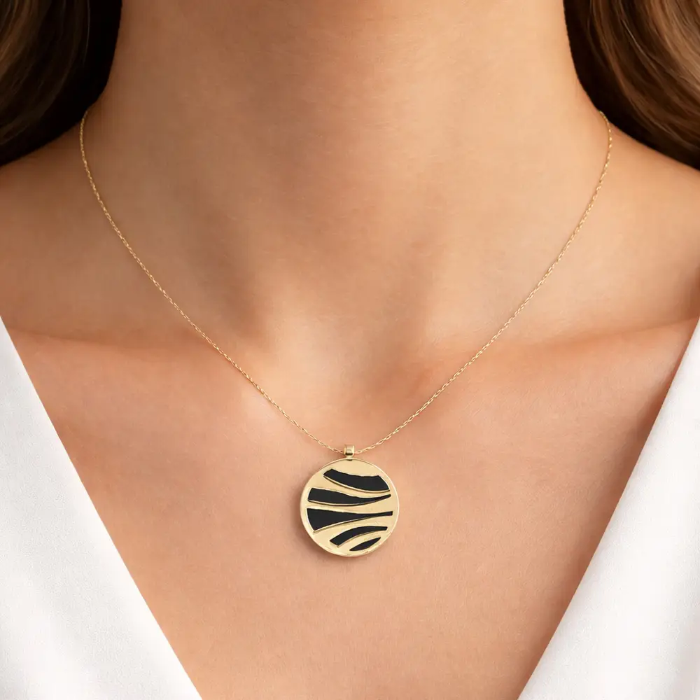 This exclusive gold necklace with black onyx captivates with its modern circular pendant, where elegant gold lines contrast beautifully with the deep black onyx. The precisely crafted design feels harmonious, timeless, and distinctive – an ideal choice for women who appreciate minimalist luxury with a strong character.