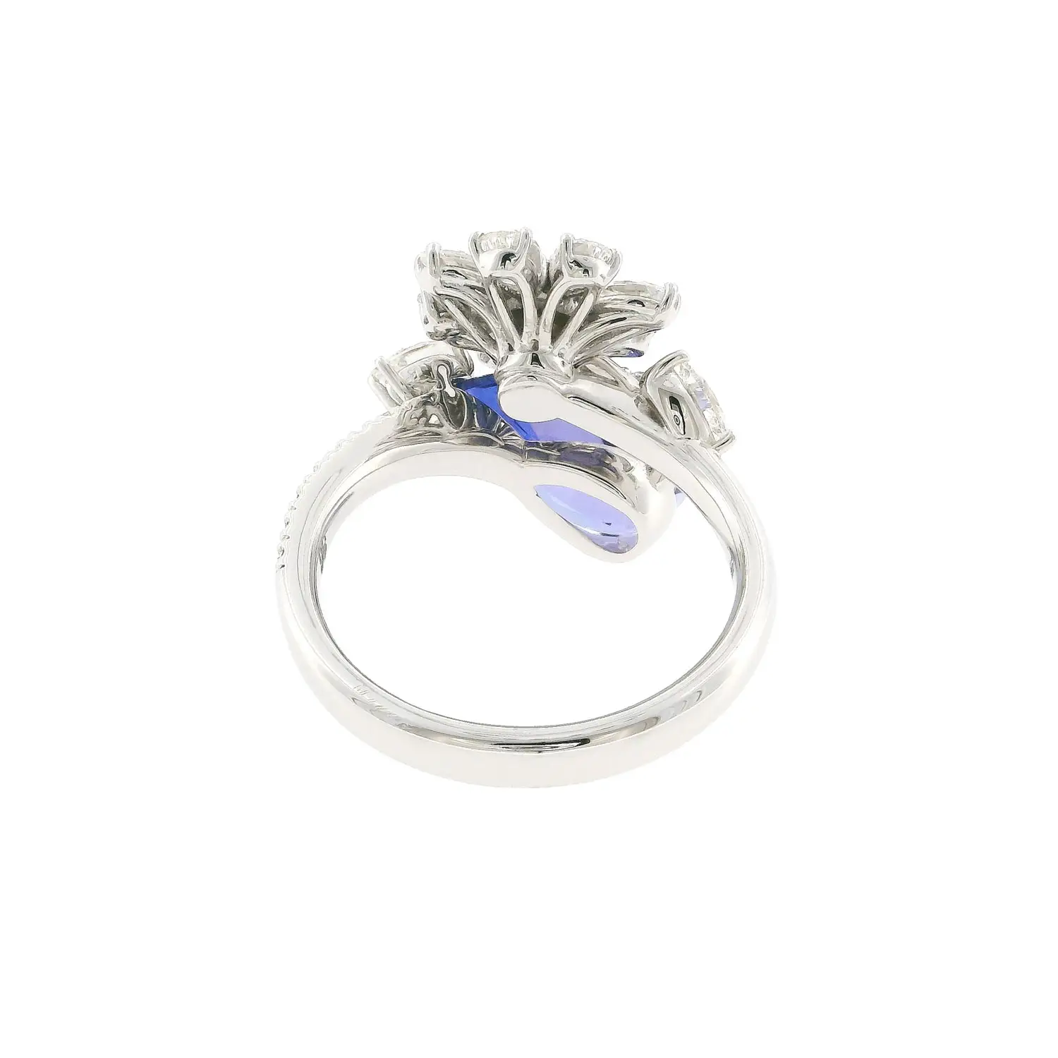 The tanzanite is complemented by diamonds with a total weight of 1.39 ct in G color and VS clarity, characterized by very good clarity and a near-colorless appearance. Their sparkle creates a beautiful contrast with the deep color of the central stone, giving the ring a luxurious and sophisticated look. The balanced composition ensures elegance from every angle.