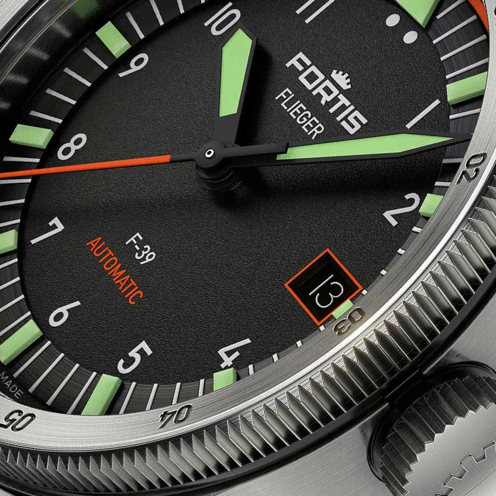 The matte black dial with bold hands and Super-LumiNova® X1 coating guarantees perfect legibility both day and night. A 12-hour rotating bezel allows for tracking a second time zone, while the orange Synchroline® aids in precise time synchronization – details that pay tribute to Fortis’ authentic aviation heritage.