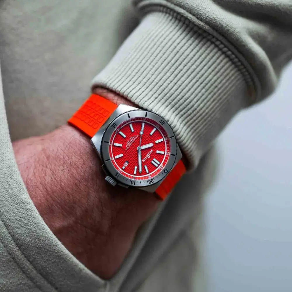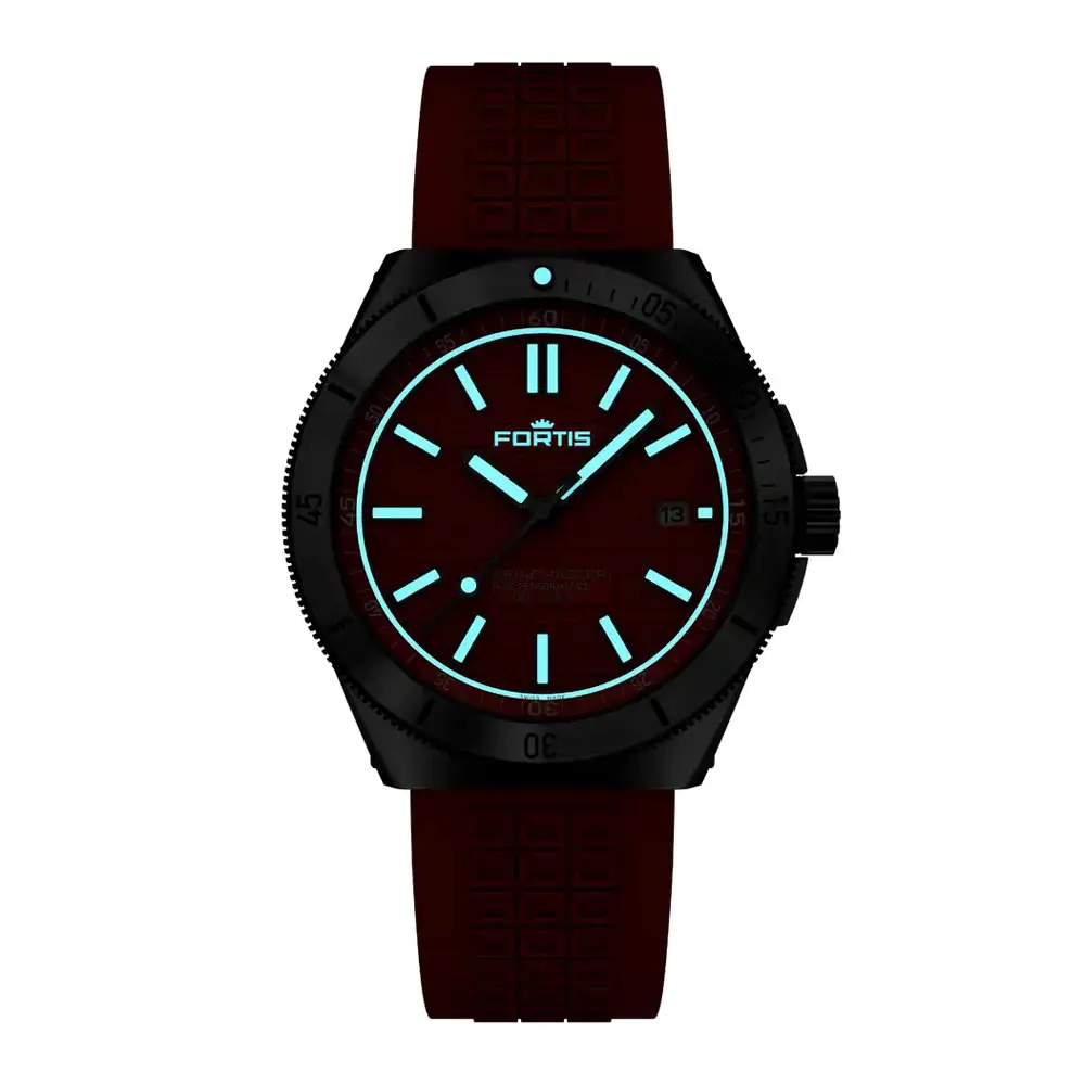 Inside the watch beats the automatic movement Fortis UW-30 Performance, based on the Sellita SW200-1 calibre. It operates at 28,800 vibrations per hour (4 Hz) and offers a power reserve of approximately 38 hours with high accuracy. The watch features a date display at the 3 o’clock position, while the dial is protected by a scratch-resistant sapphire crystal with double anti-reflective coating.