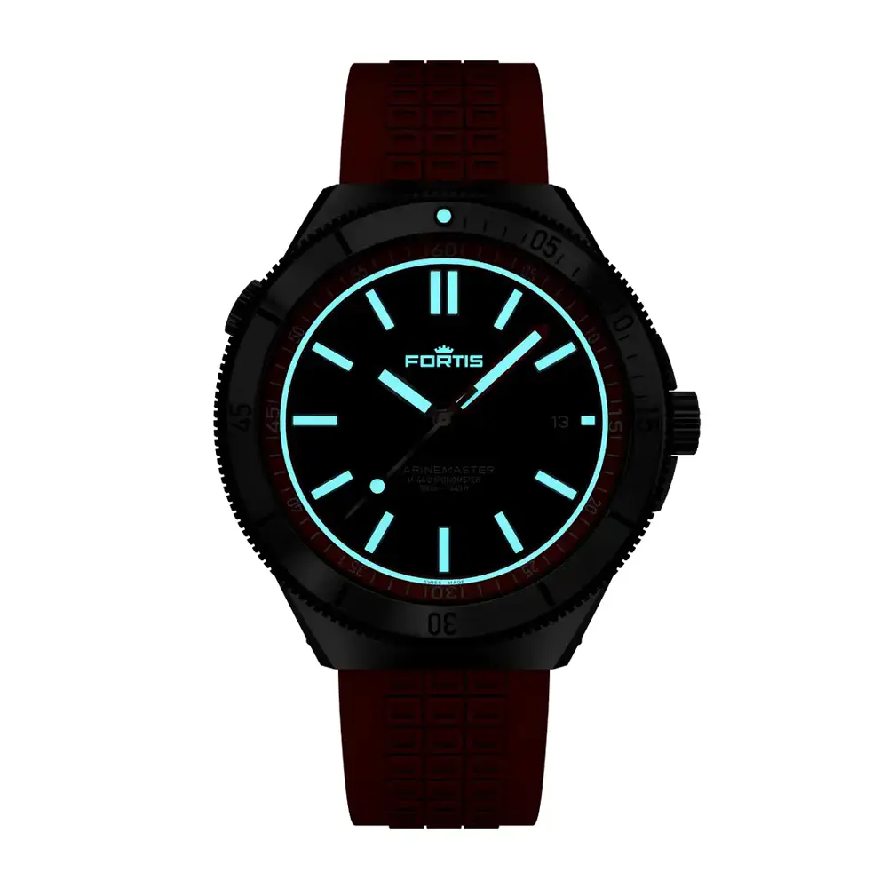 Inside beats the in-house Fortis Werk 11 calibre, developed in collaboration with Kenissi, offering a 70-hour power reserve and COSC certification for exceptional accuracy and reliability. Fitted on a sporty amber-orange Horizon rubber strap, the Marinemaster M-44 is a true symbol of courage, performance, and innovation — ready for every challenge.