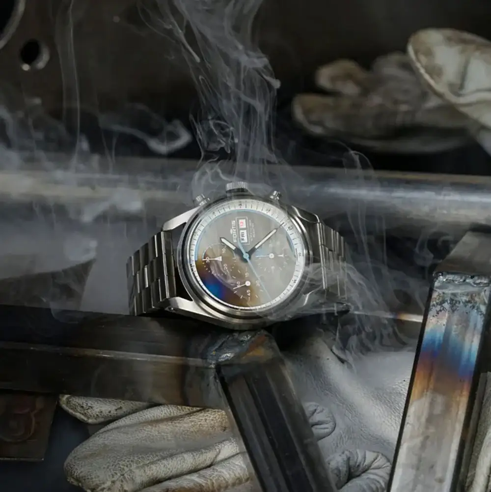 Inside beats the manufacture caliber Fortis WERK 17 with up to 60-hour power reserve. The movement features a column-wheel chronograph, day-date function, small seconds and hacking. A sapphire crystal with anti-reflective coating protects the dial, while the exhibition caseback reveals the movement.