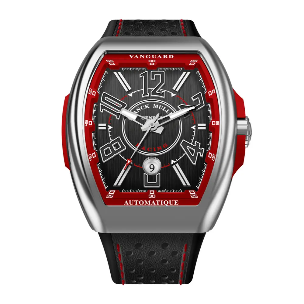 The sporty Franck Muller Vanguard Racing in a striking red-accented configuration blends motor racing aesthetics with the refined elegance of contemporary watchmaking. The tonneau-shaped case appears dynamic and modern, paired with a contrasting dial featuring applied numerals, layered lacquer, and meticulous finishing details.