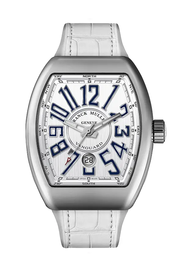 Design elements such as large applied numerals, distinctive hands, sporty rubber or textile straps and skeletonised dials give the Vanguard collection a distinctive and contemporary look. Watches often include complications such as a chronograph, tourbillon or automatic date calibre, all powered by Franck Muller's own mechanical movements.