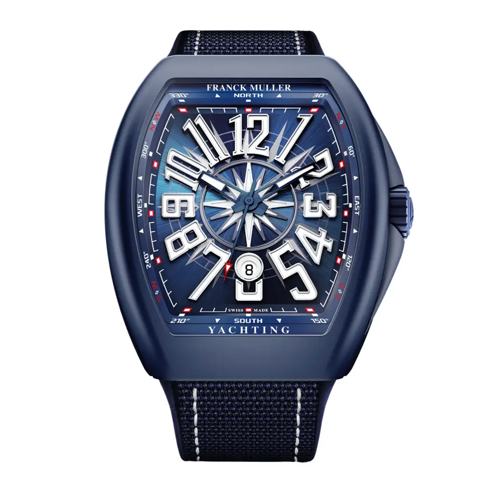 The Vanguard Yachting collection channels Franck Muller’s nautical inspiration through an interplay of light, orientation and dynamic geometry. The V 45 SC DT YACHT CR BL MC (BL) places the blue dial with a compass rose at centre stage, providing visual depth and a strong maritime identity. Applied numerals with the signature typographic style ensure high legibility and a bold aesthetic.