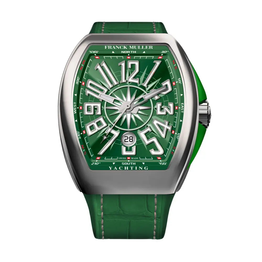The Franck Muller Vanguard Yachting V43 SC DT YACHT (VR) brings a maritime spirit in a modern, sporty design. Its striking green dial with a compass rose motif and luminescent indexes immediately catches the eye. The elegant color combination with a dark green strap and matching side inserts creates a visual harmony that evokes the open sea and freedom.