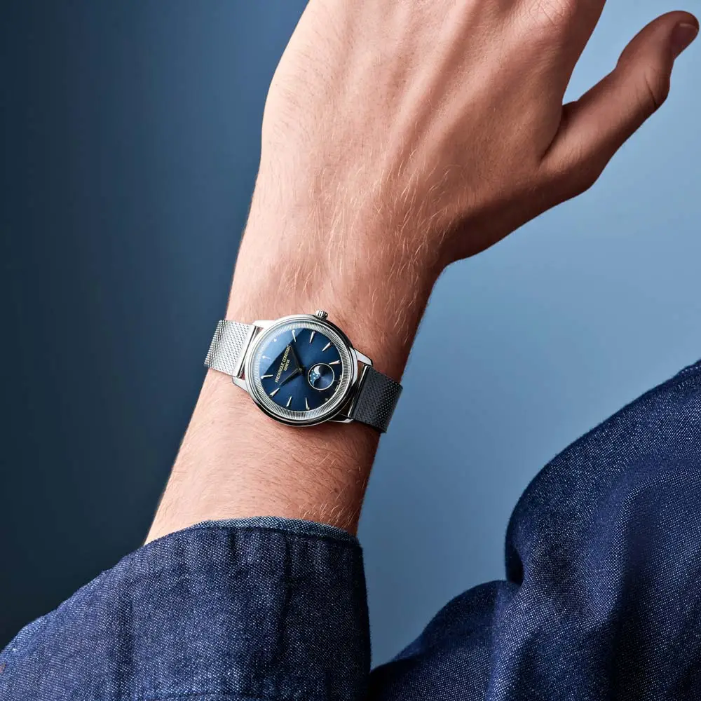 The Frederique Constant Classics Moneta Moonphase FC-206N3S6B embodies the essence of classic Swiss elegance interpreted in a contemporary way. The blue sunray dial creates a calm and refined impression, enhanced by the moonphase display at 6 o’clock. Clean lines, delicate indexes, and balanced proportions give this model a timeless character, suitable for both everyday wear and formal occasions.