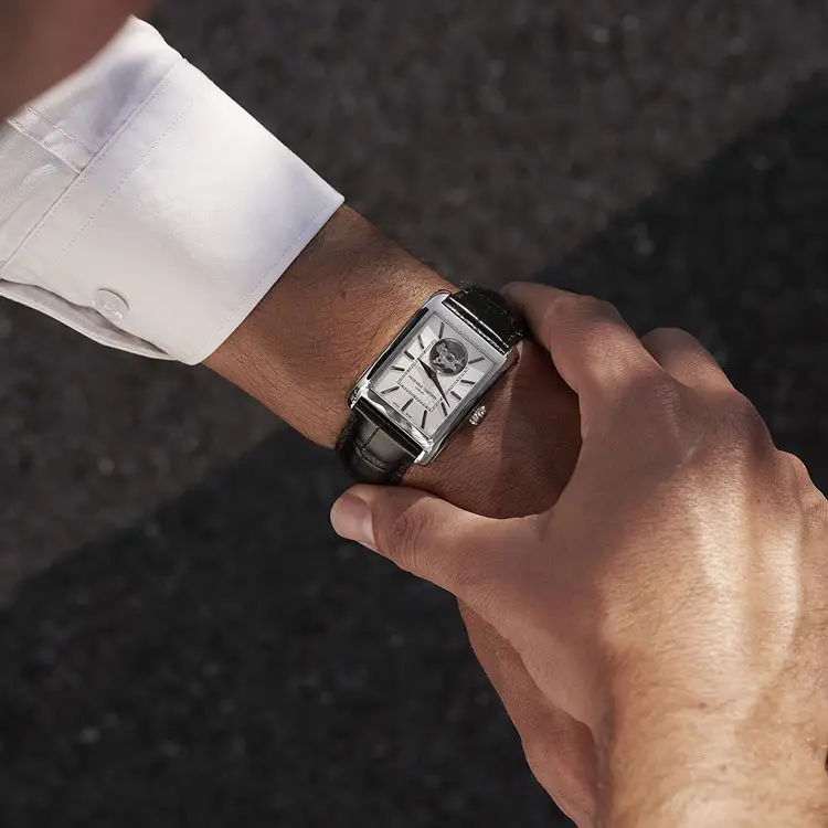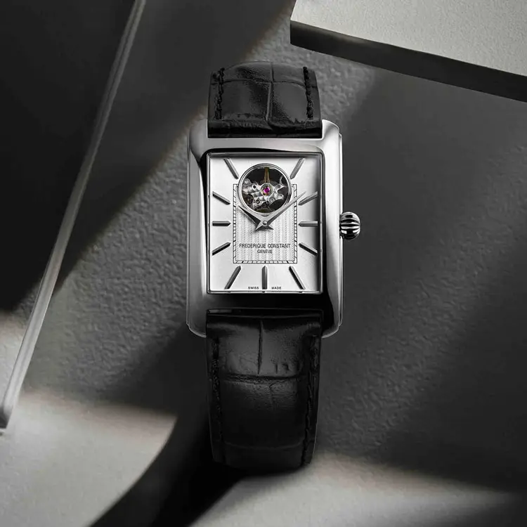 The Frédérique Constant Classics Carrée Heart Beat FC-311S4C6 represents a harmonious blend of classical style and modern watchmaking craftsmanship. These elegant men's timepieces feature a rectangular stainless steel case measuring 30.4 × 33.3 mm, inspired by the aesthetics of the 1930s, adding a sophisticated touch. The dominant feature is the “Heart Beat” opening on the silver dial, revealing the beating heart of the precise Swiss movement and symbolizing mechanical vitality.