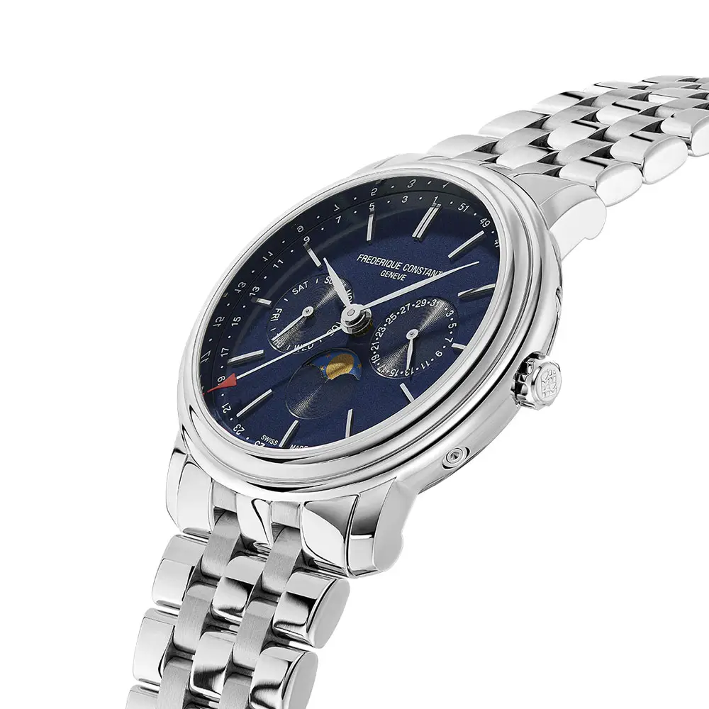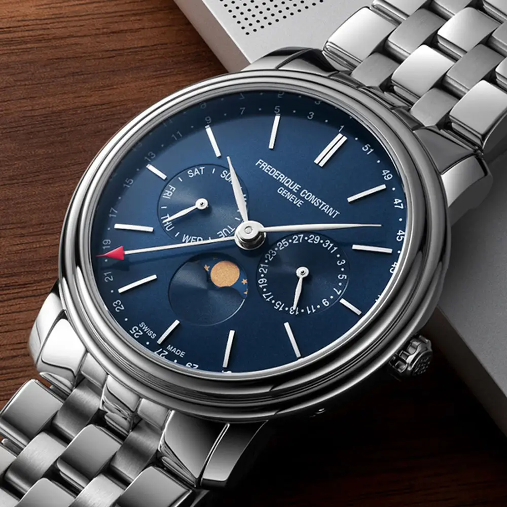The Frederique Constant Classics Index Business Timer combines elegant design with practical everyday complications. Its 40 mm stainless steel case offers balanced proportions, while the blue dial with applied indexes gives the watch a refined, modern character suitable for business and formal wear.