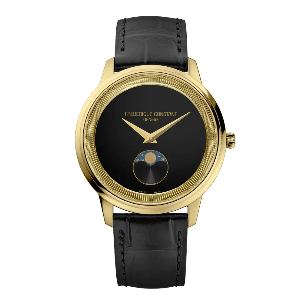 The Frederique Constant Classics Moneta Moonphase FC-206B3S5 embodies timeless elegance and refined Swiss watchmaking. The black dial with a minimalist design contrasts beautifully with the gold-tone case, while the moonphase display at 6 o’clock adds a poetic and visually appealing element. Balanced proportions and clean lines make this timepiece suitable for both everyday wear and formal occasions.