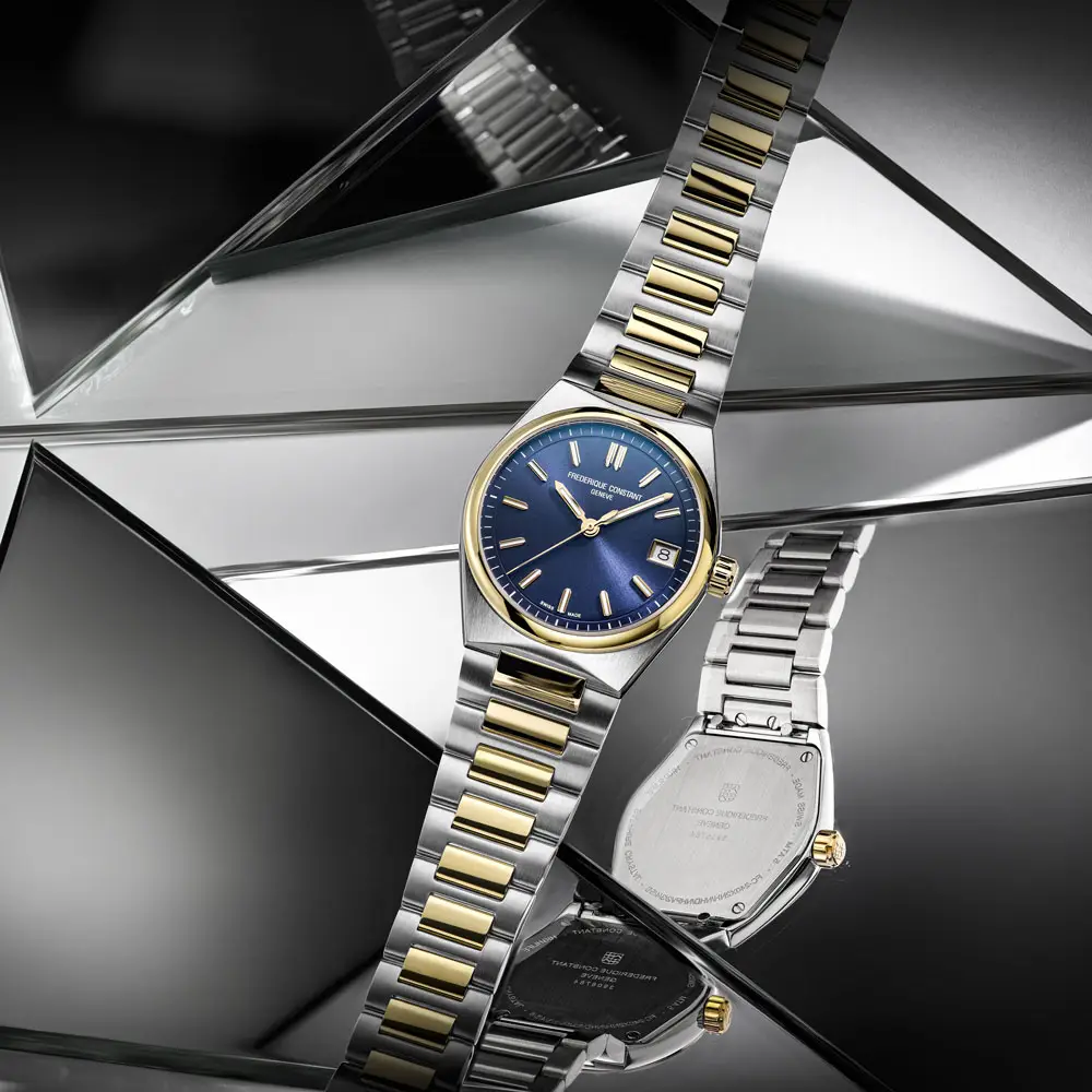 The Frederique Constant Highlife Ladies Quartz watch represents a modern interpretation of sporty elegance in a feminine design. Its distinctive integrated stainless steel case with bicolor PVD finish flows seamlessly into the bracelet, while the deep blue sunray dial adds a refined yet expressive visual character.