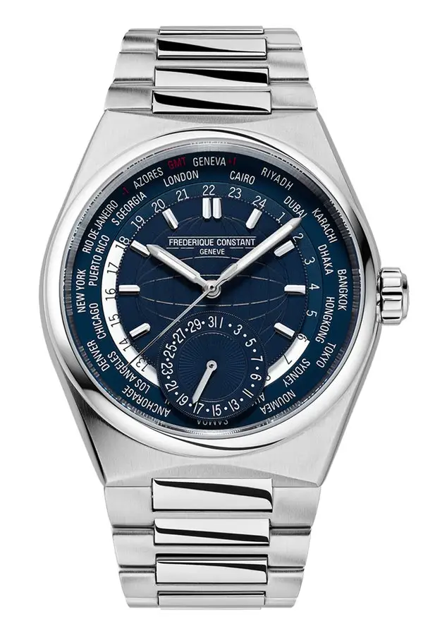 The Frederique Constant Manufacture Highlife Worldtimer FC-718N4NH6B is an exceptional men's timepiece that blends refined aesthetics, functional complexity, and Swiss craftsmanship. Ideal for the modern man who travels frequently and needs reliable access to global time zones. The round 41 mm stainless steel case houses a sophisticated blue analog dial with a world time function. A rotating inner ring displays 24 major cities, allowing easy tracking of time across the globe. Detailed product description