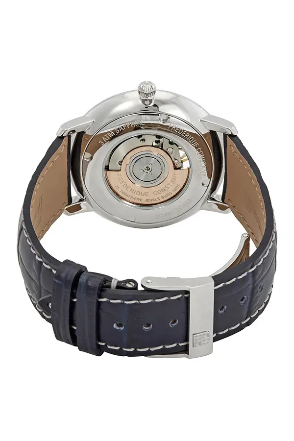 Frederique Constant lets timeless elegance shine through in its Slimline range. This men's luxury watch is particularly eye-catching because of its attractive contrast, with an imaginatively designed dial emerging from a uniform dark blue base. The detail in its face allows a glimpse into the heart of the watch and is the only decorative element. The watch is reliably controlled by a classic movement with automatic winding.