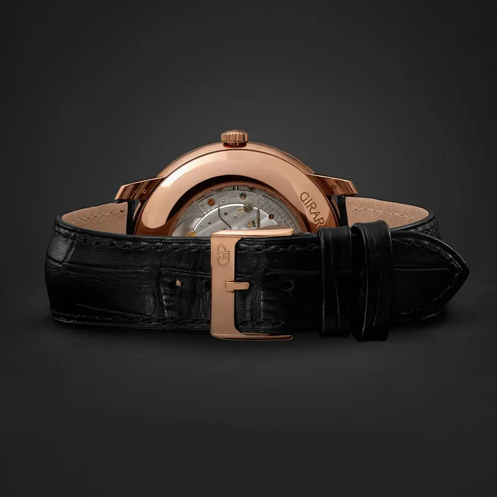 The Girard-Perregaux 1966 is the embodiment of classic elegance and superior Swiss craftsmanship. Its round case with a diameter of 40 mm is made of luxurious 18-carat rose gold, as is the bezel, giving the watch a sophisticated and timeless appearance.