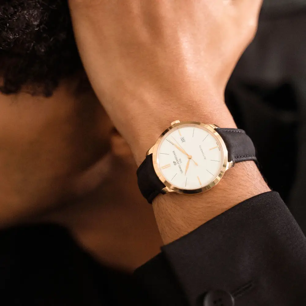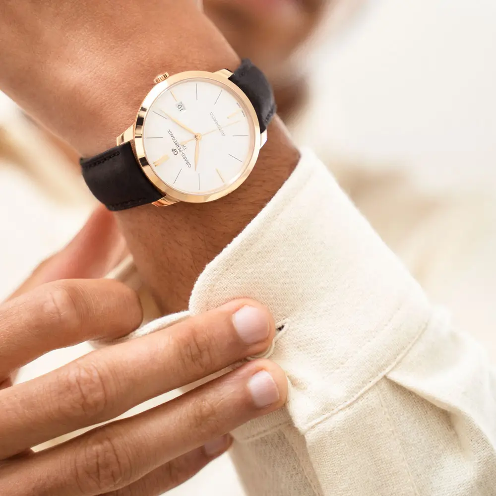 The design of the models is clean and sophisticated - the thin round case, gently curved sapphire crystal, narrow indexes and elegant hands create a balanced and refined aesthetic. At the heart of the watch ticks Girard-Perregaux's own Manufacture movements, often with complications such as the date, moon phase, or annual calendar.