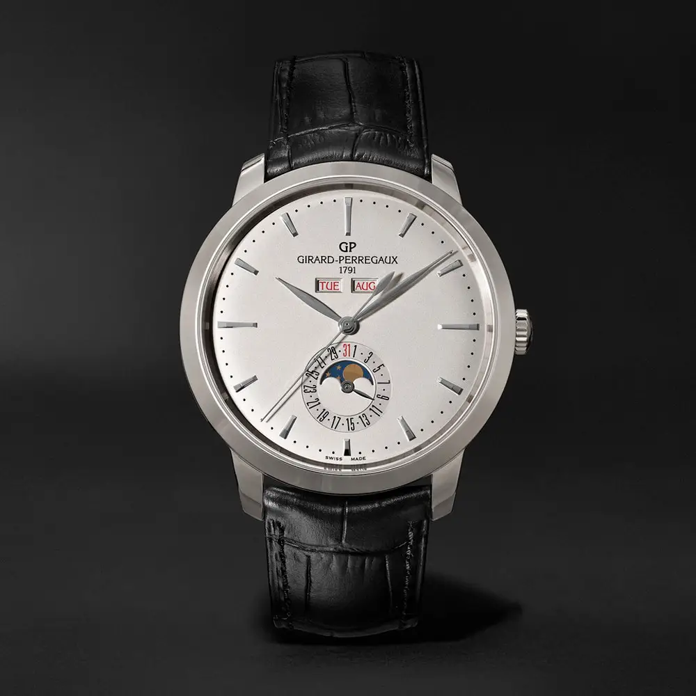 The design of the models is clean and sophisticated - the thin round case, gently curved sapphire crystal, narrow indexes and elegant hands create a balanced and refined aesthetic. At the heart of the watch ticks Girard-Perregaux's own Manufacture movements, often with complications such as the date, moon phase, or annual calendar.