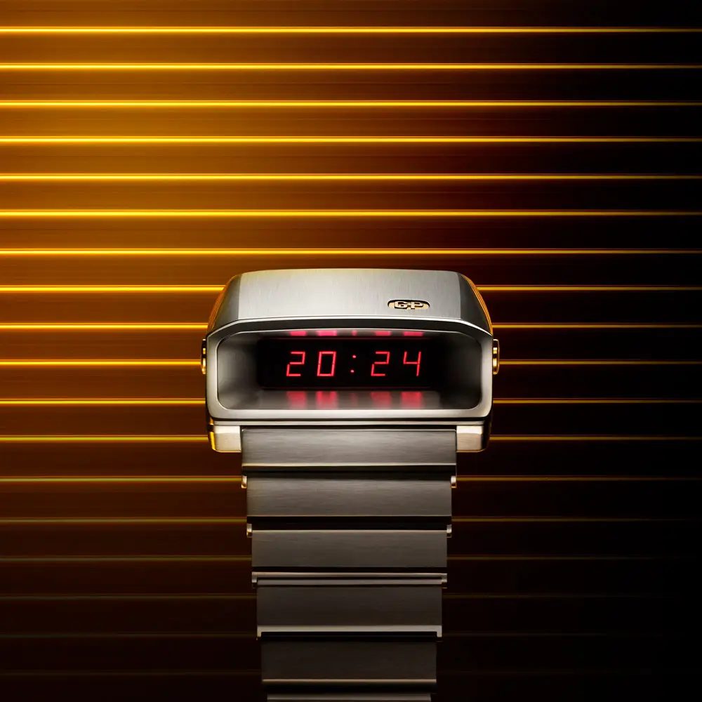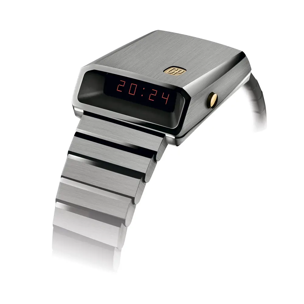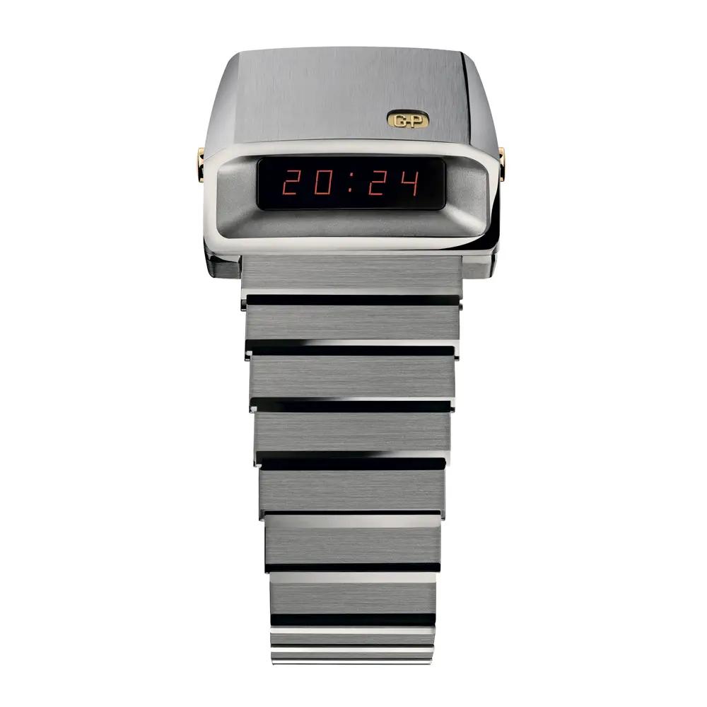 The signature tunnel-shaped red LED display shows time, date, day, month, year, chronograph, and a second time zone, along with the unique “secret date” function. Powered by the quartz calibre GP3980-1474, it delivers exceptional precision and reliability.