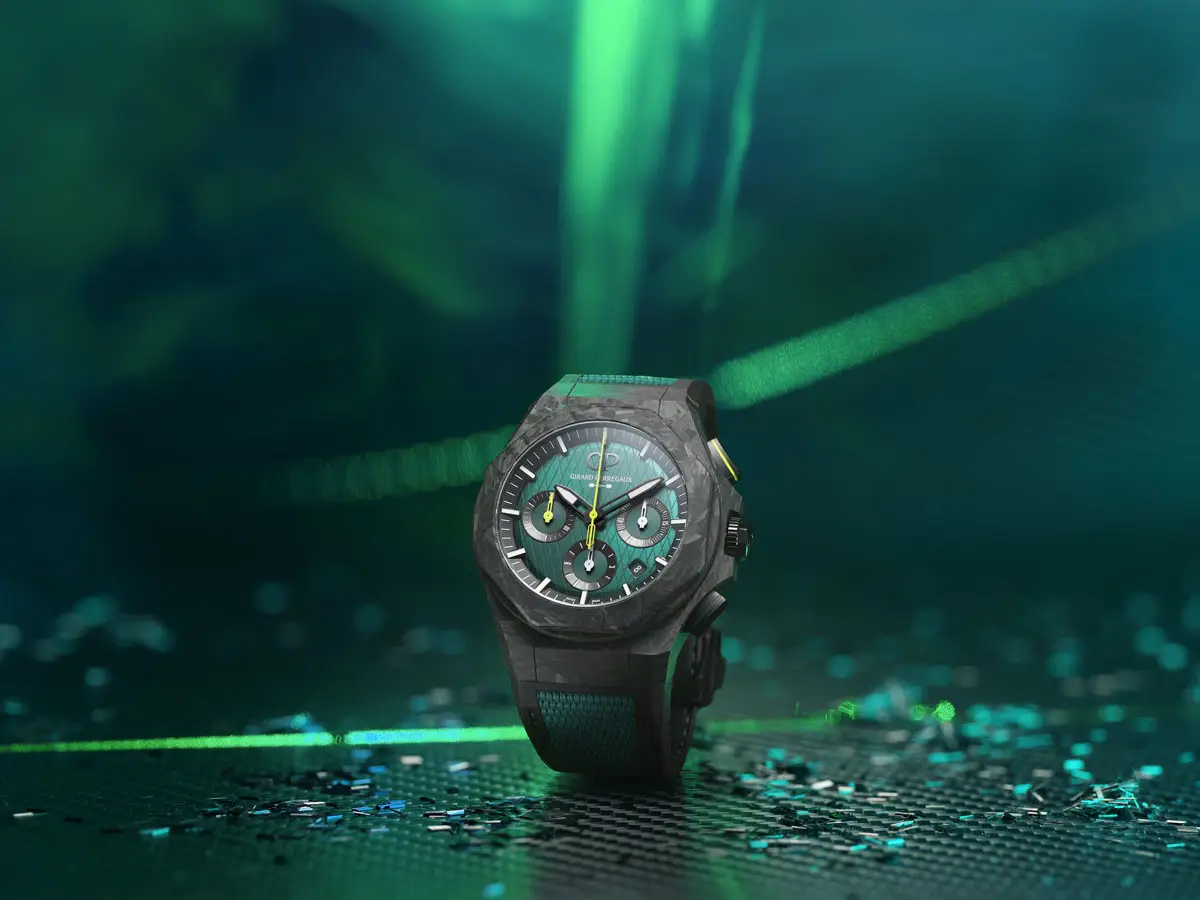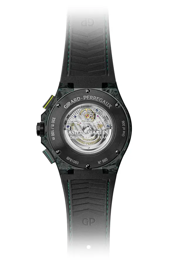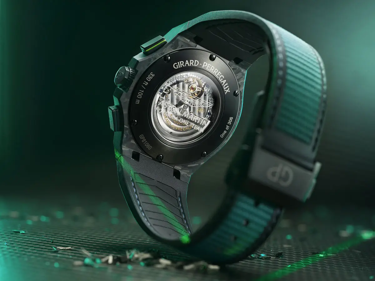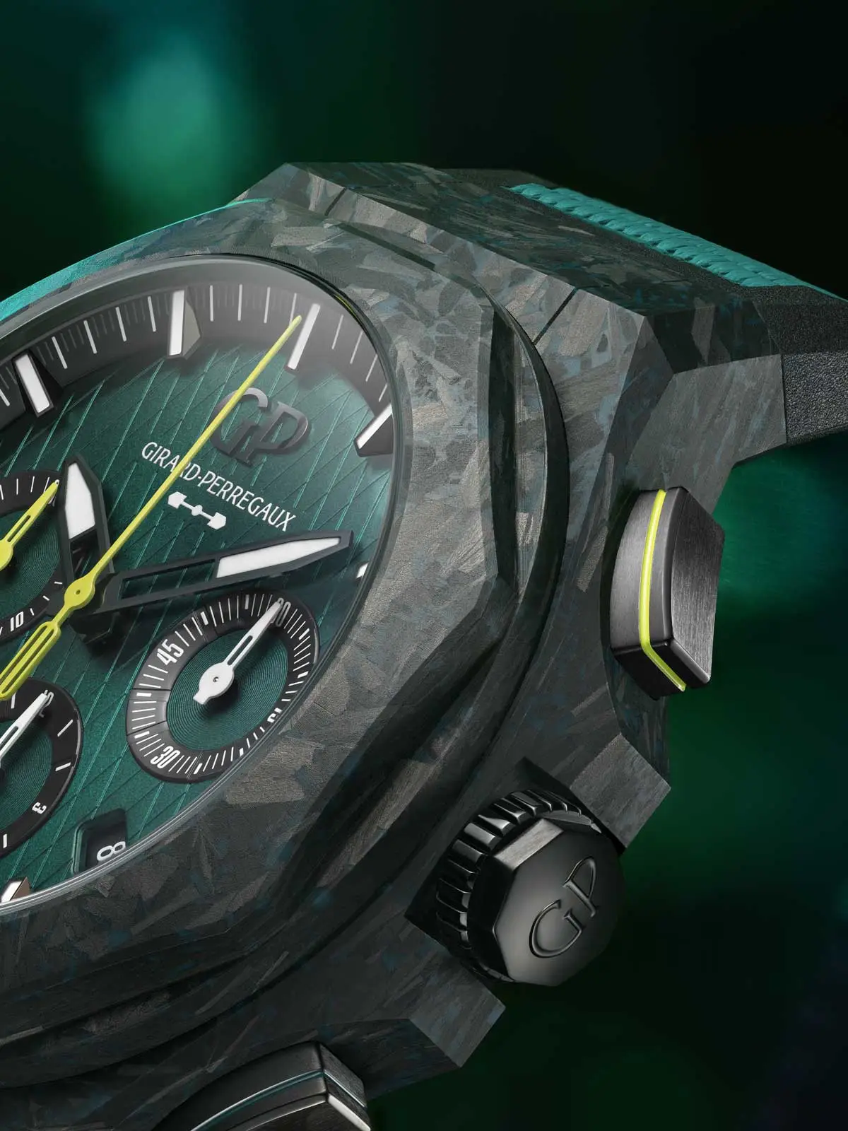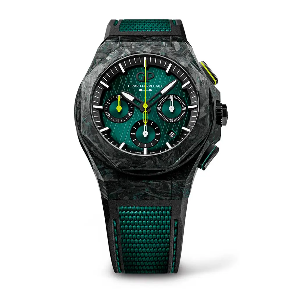 The Girard-Perregaux Laureato Absolute Chronograph Aston Martin F1 Edition unites Swiss watchmaking mastery with Formula 1 innovation in a striking limited edition of 306 pieces. Its 44 mm titanium-carbon case incorporates carbon fibre from actual Aston Martin F1 Team race cars from the 2021 season, underscoring both technical exclusivity and a bold sporting spirit.