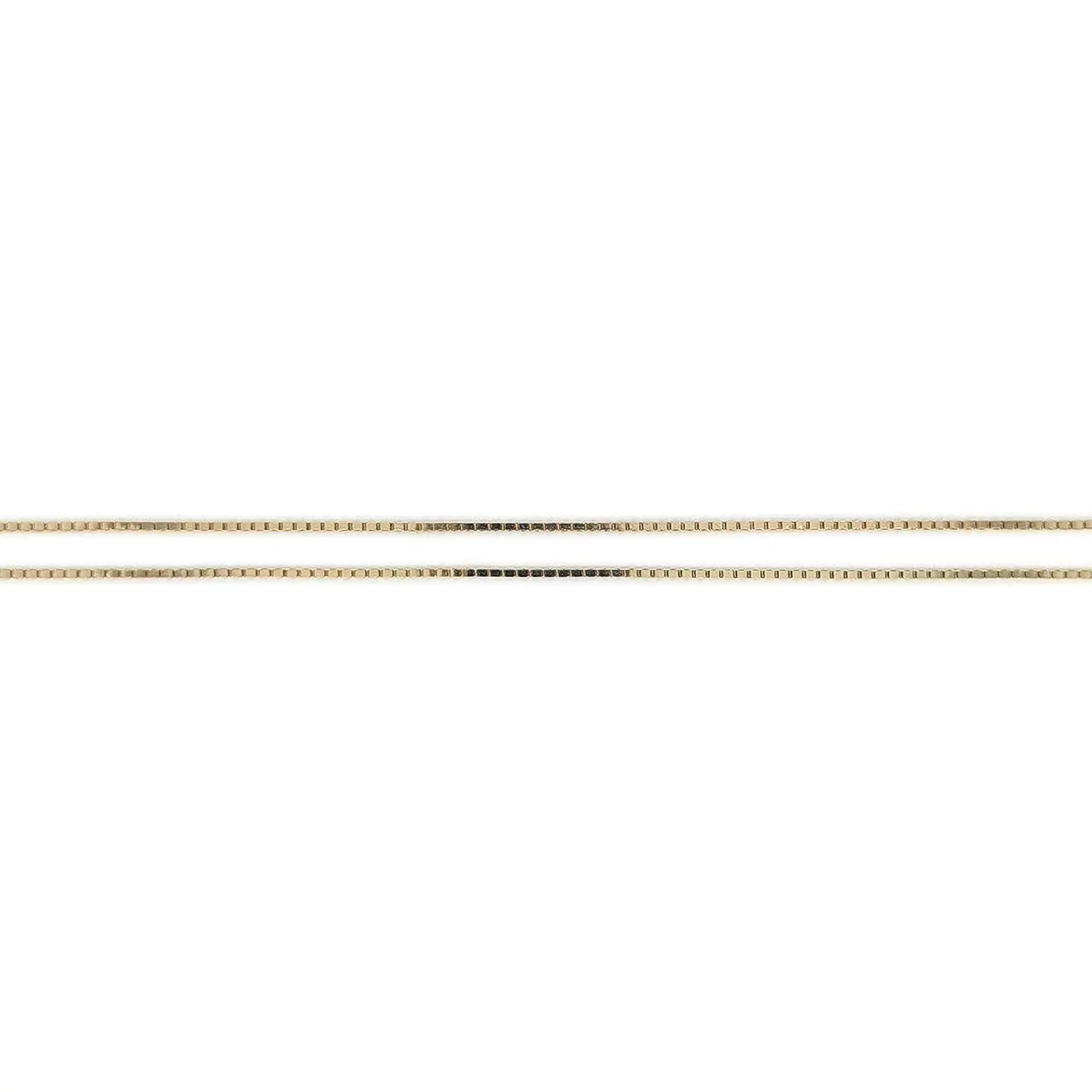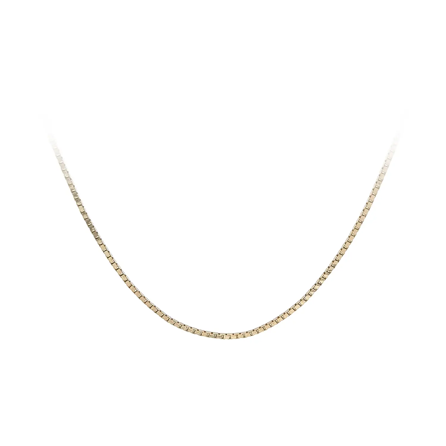 The gold box chain features precisely shaped, square links that create a clean and modern look. Its geometric design gives the chain an elegant shine and a timeless character, making it suitable for wearing on its own or with a delicate pendant.