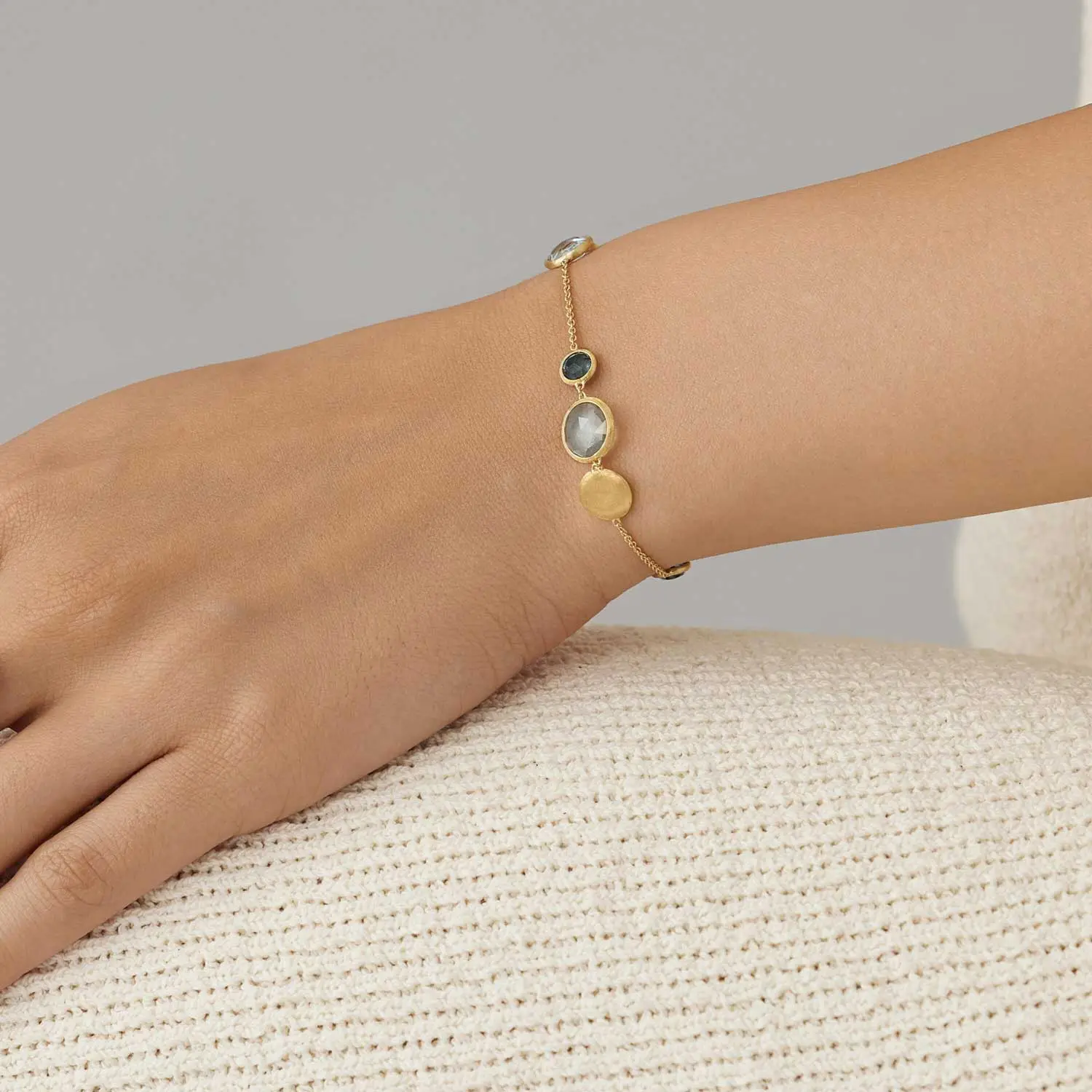 The luxurious Marco Bicego Jaipur Color BB1485 MIX725 Y 02 gold bracelet is crafted from 18k yellow gold (750/1000) and belongs to the elegant Jaipur Color collection, inspired by the vibrant colors of gemstones and the traditional art of gemstone cutting in the Indian city of Jaipur. The bracelet combines a delicate gold chain with decorative natural gemstones, creating a harmonious and elegant composition.