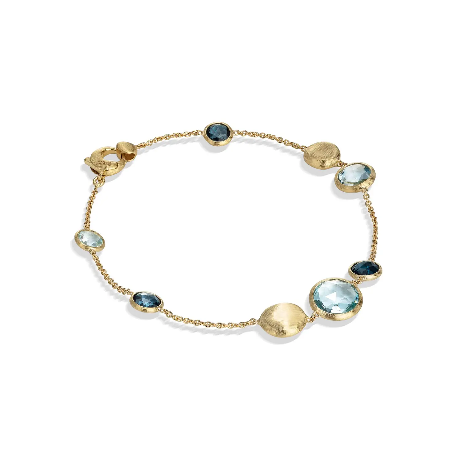 Model BB1485 MIX725 Y 02 measures approximately 18.5 cm in length, allowing it to sit elegantly on the wrist while remaining light and comfortable to wear. The combination of 18k gold, vibrant blue topaz gemstones, and precise Italian craftsmanship by Marco Bicego creates a timeless piece of jewelry suitable for everyday wear as well as an exclusive gift.