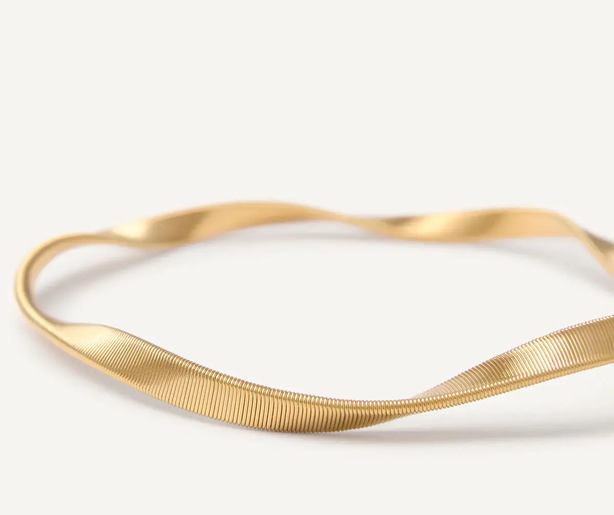 Each piece is crafted from 18kt gold and adorned with the signature hand-twisted coil technique, a hallmark of Marco Bicego. This detail creates subtle movement, texture, and depth, making the jewellery feel alive and unique. Marrakech includes necklaces, bracelets, earrings, and rings, often enhanced with diamonds for added brilliance.