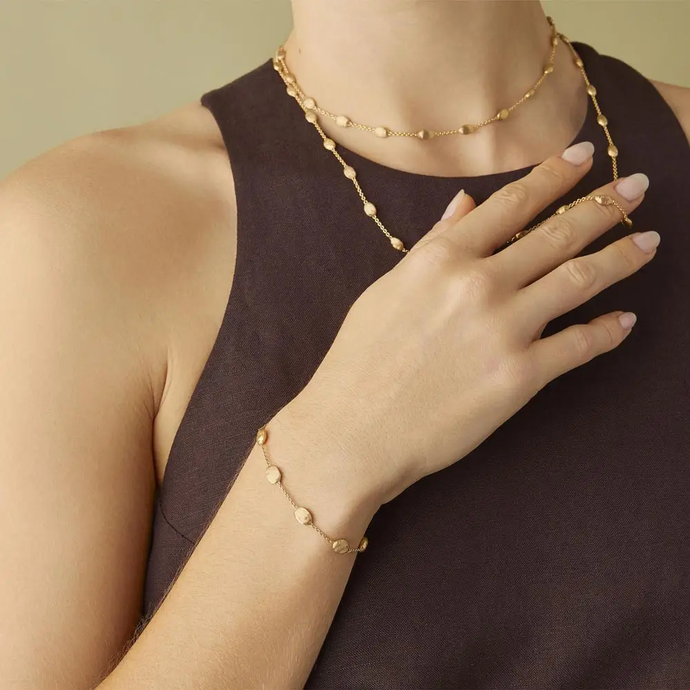 Each piece is handcrafted in Marco Bicego’s ateliers and decorated with the hand-engraved bulino technique, which creates a silky matte surface. The delicate gold elements are connected by airy chains that move naturally with the body. The Siviglia collection includes necklaces, bracelets, earrings, and rings, often enriched with diamonds for added sophistication.
