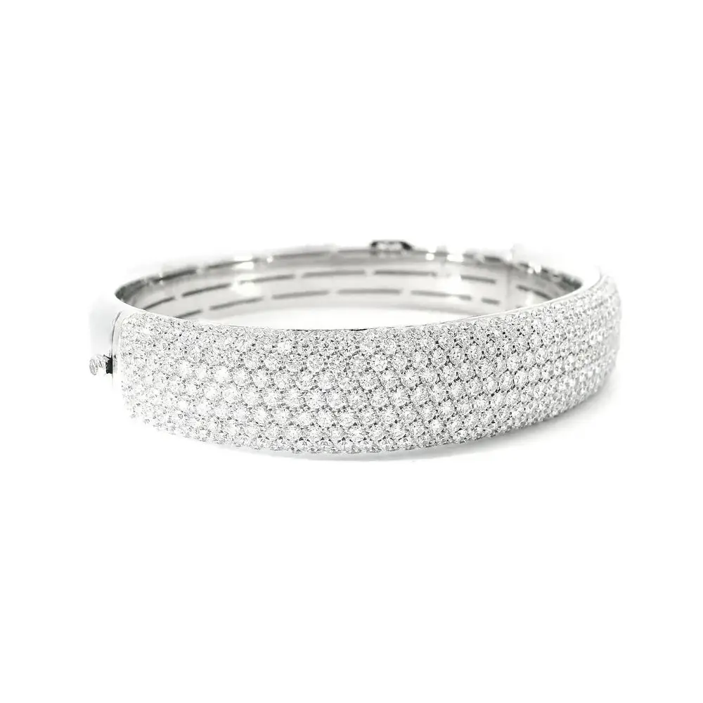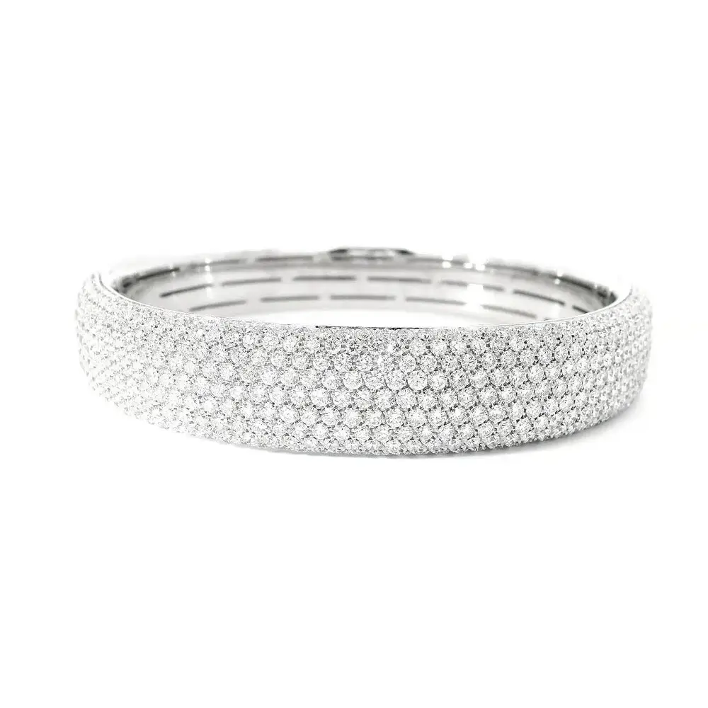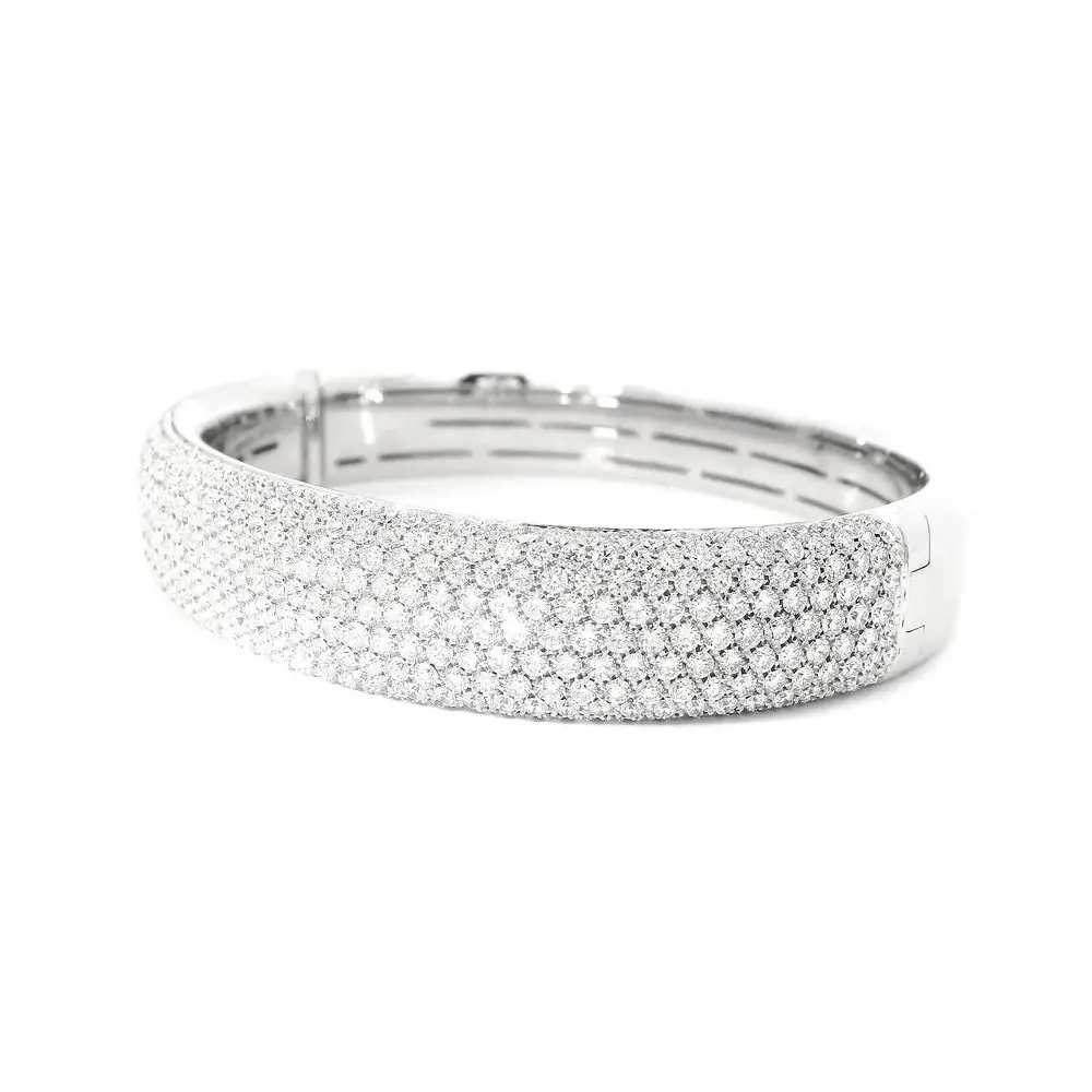 The bracelet is adorned with 710 natural white diamonds with a total weight of 12.90 ct, each measuring 1.70 mm. Their Round Brilliant Cut ensures maximum sparkle and clarity. Diamonds of G colour and VS clarity produce a uniform, radiant glow, giving the bracelet the appearance of a continuous ribbon of light around the wrist.