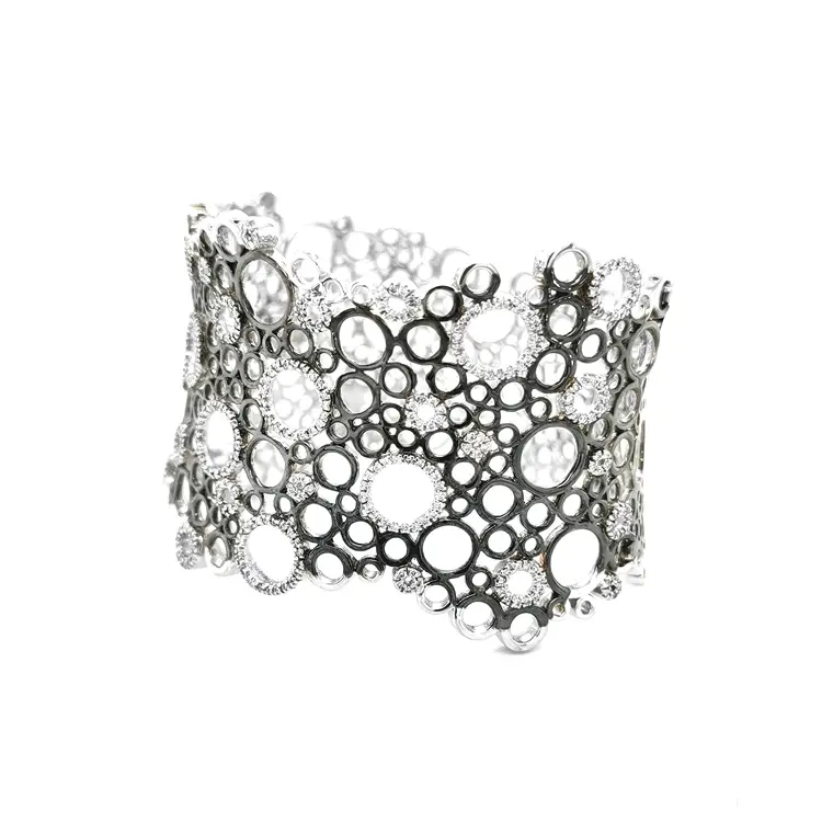 With its bold 40.00 mm width, the bracelet makes a striking statement while retaining effortless grace. It is adorned with 346 natural round-cut diamonds, totalling 3.41 ct (1.20 mm each, colour G, clarity VS). Each stone captures light with remarkable brilliance, illuminating the wrist in a cascade of reflections.