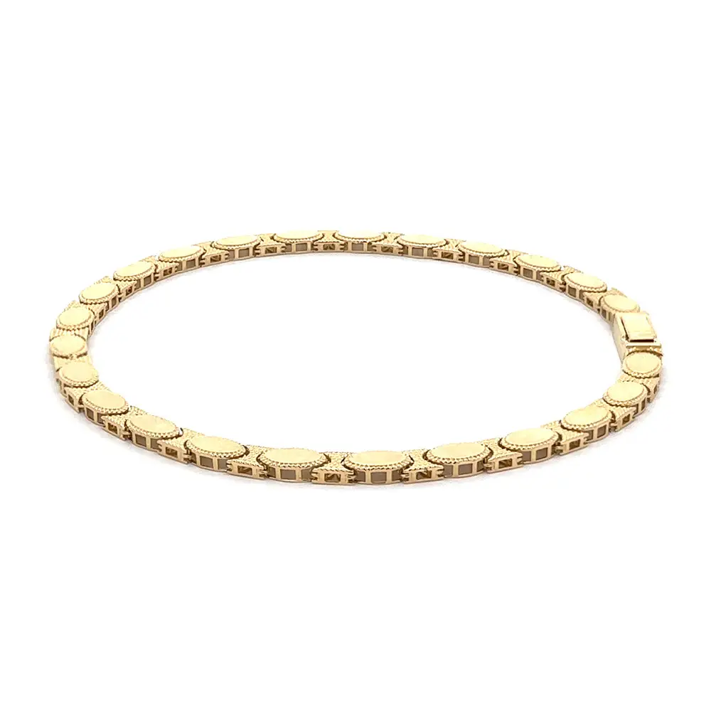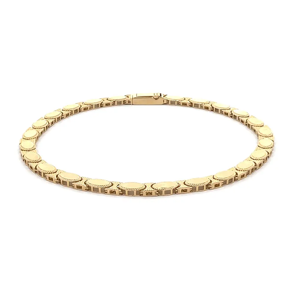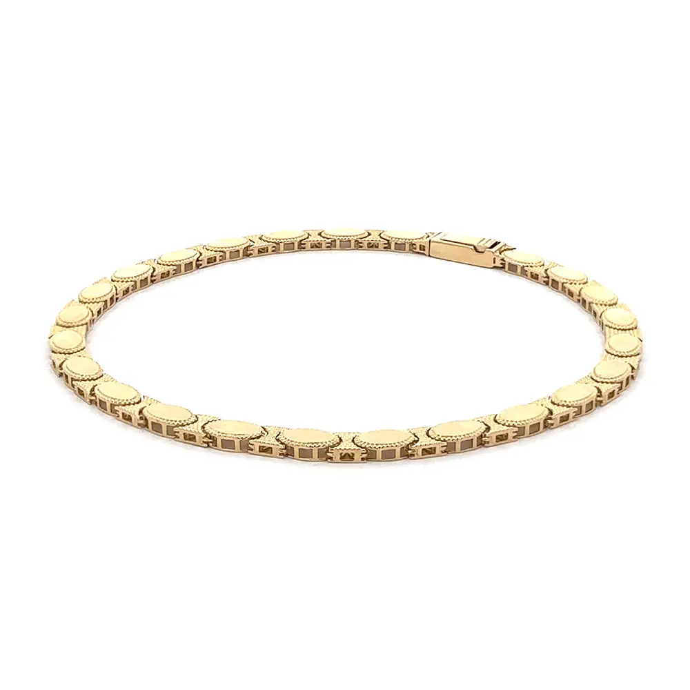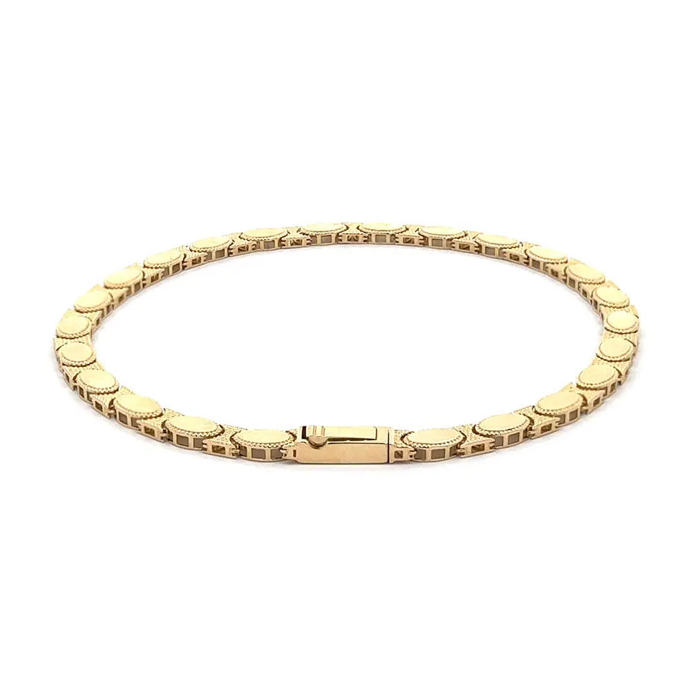 The gold bracelet with oval links embodies classic elegance and exquisite craftsmanship. Each link is delicately shaped into an oval form and framed with a fine texture that adds depth and refined sparkle.