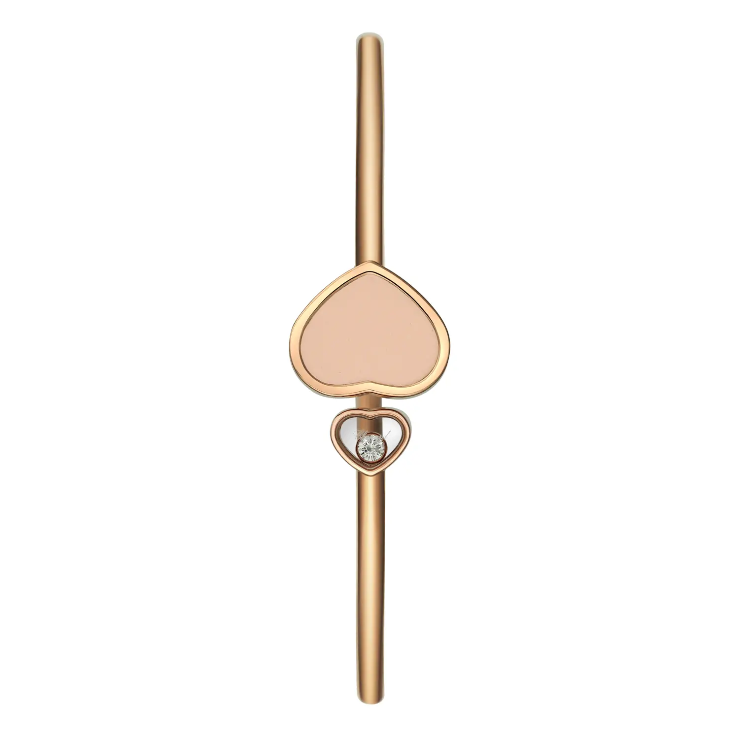 This charming bracelet from the Happy Hearts collection blends romance, softness, and Chopard’s iconic design. Crafted in 18 k rose gold, it features a pink stone heart and a freely moving diamond of approximately 0.05 ct, embodying femininity and joyful energy. The contrast between the warm pink tones and the sparkle of the diamond creates a piece that lights up every moment.