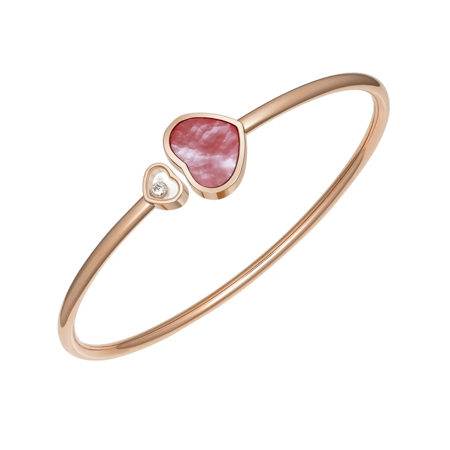 This graceful bracelet from the Happy Hearts collection embodies joy, love, and femininity. Crafted in 18 k rose gold, it features a red stone heart and Chopard’s signature freely moving diamond of approximately 0.05 ct, symbolizing optimism and elegance. The smooth, polished design enhances its luxurious appeal, while the vibrant red hue brings energy and passion.