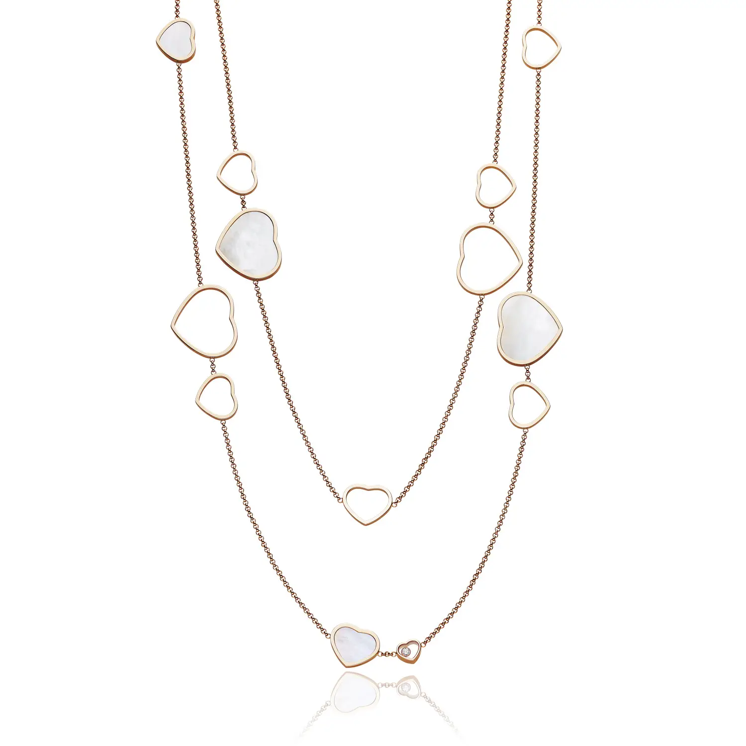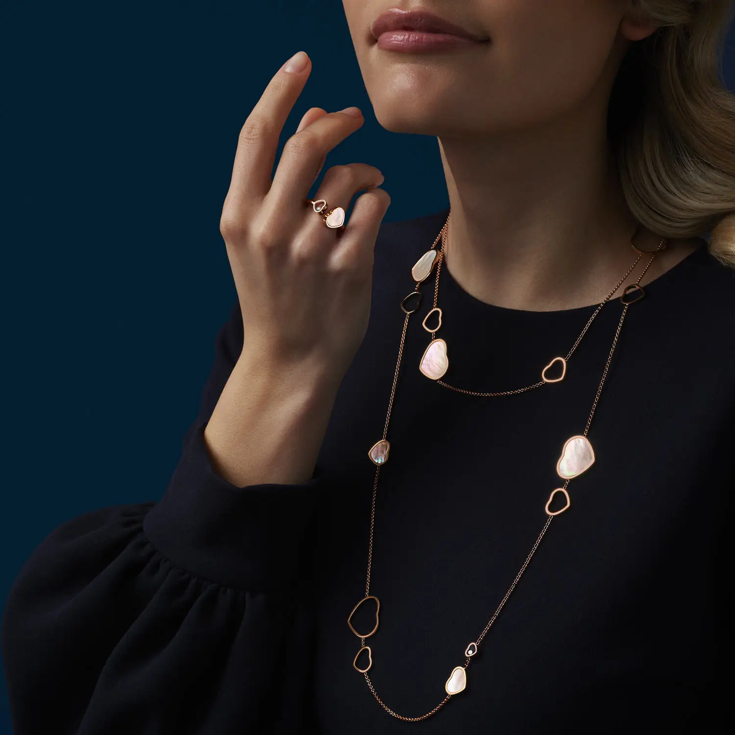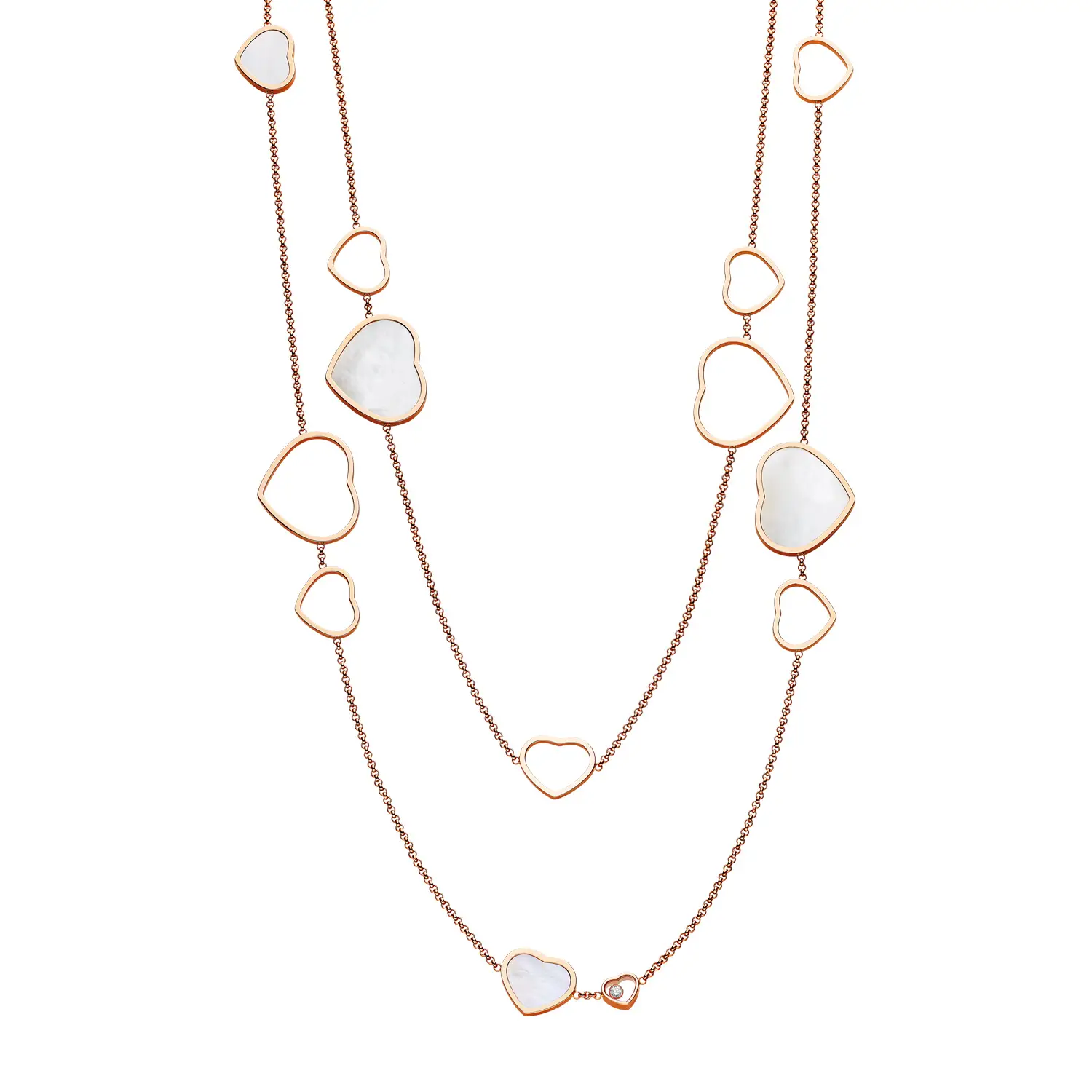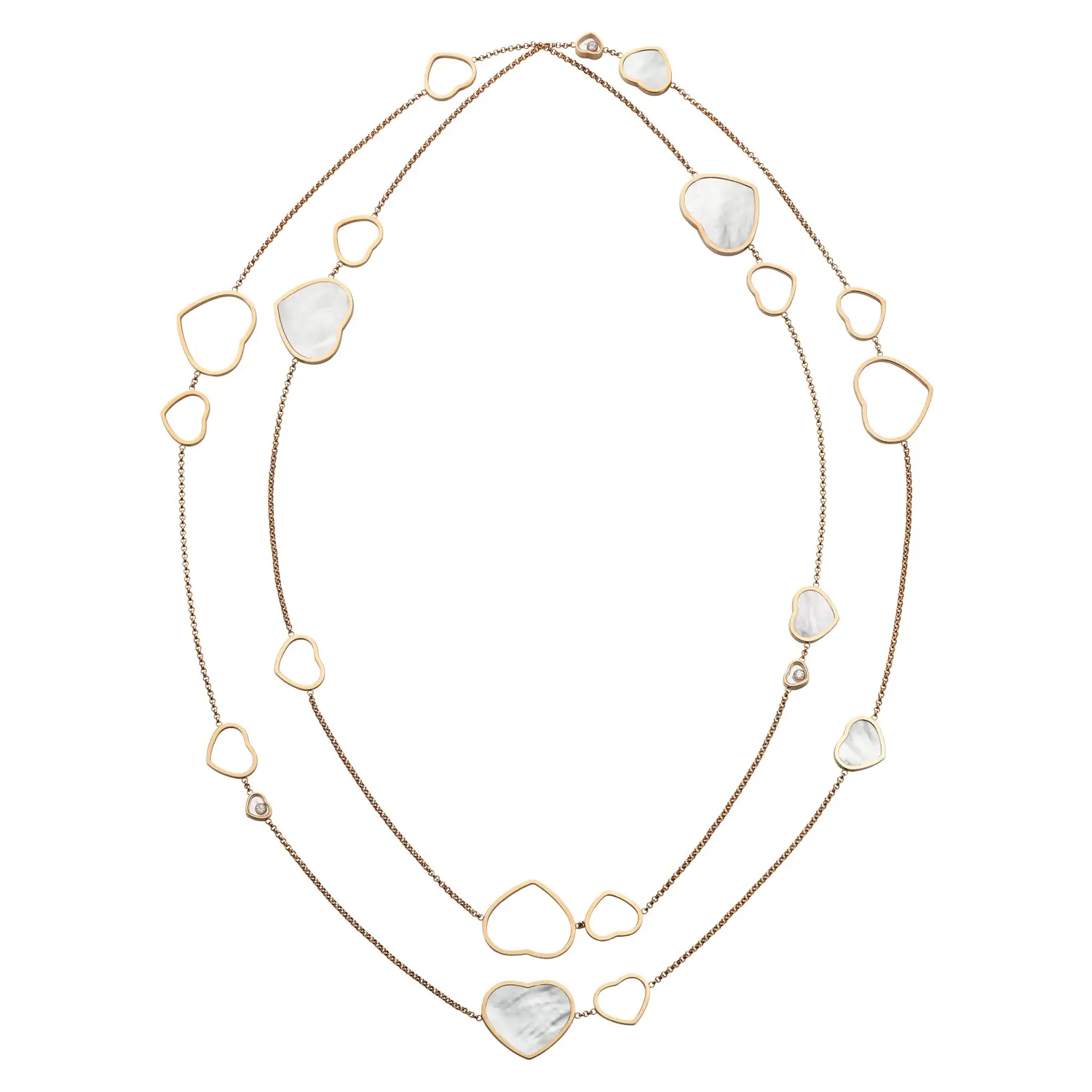 This exquisite necklace from the Happy Hearts collection perfectly balances playfulness and elegance. Crafted in 18 k rose gold and adorned with heart motifs made of genuine mother-of-pearl, enhanced by brilliant diamonds totalling approximately 0.15 ct, it radiates delicate yet captivating charm. Every detail reflects Chopard’s signature craftsmanship – a celebration of love, happiness, and feminine grace in its purest form.