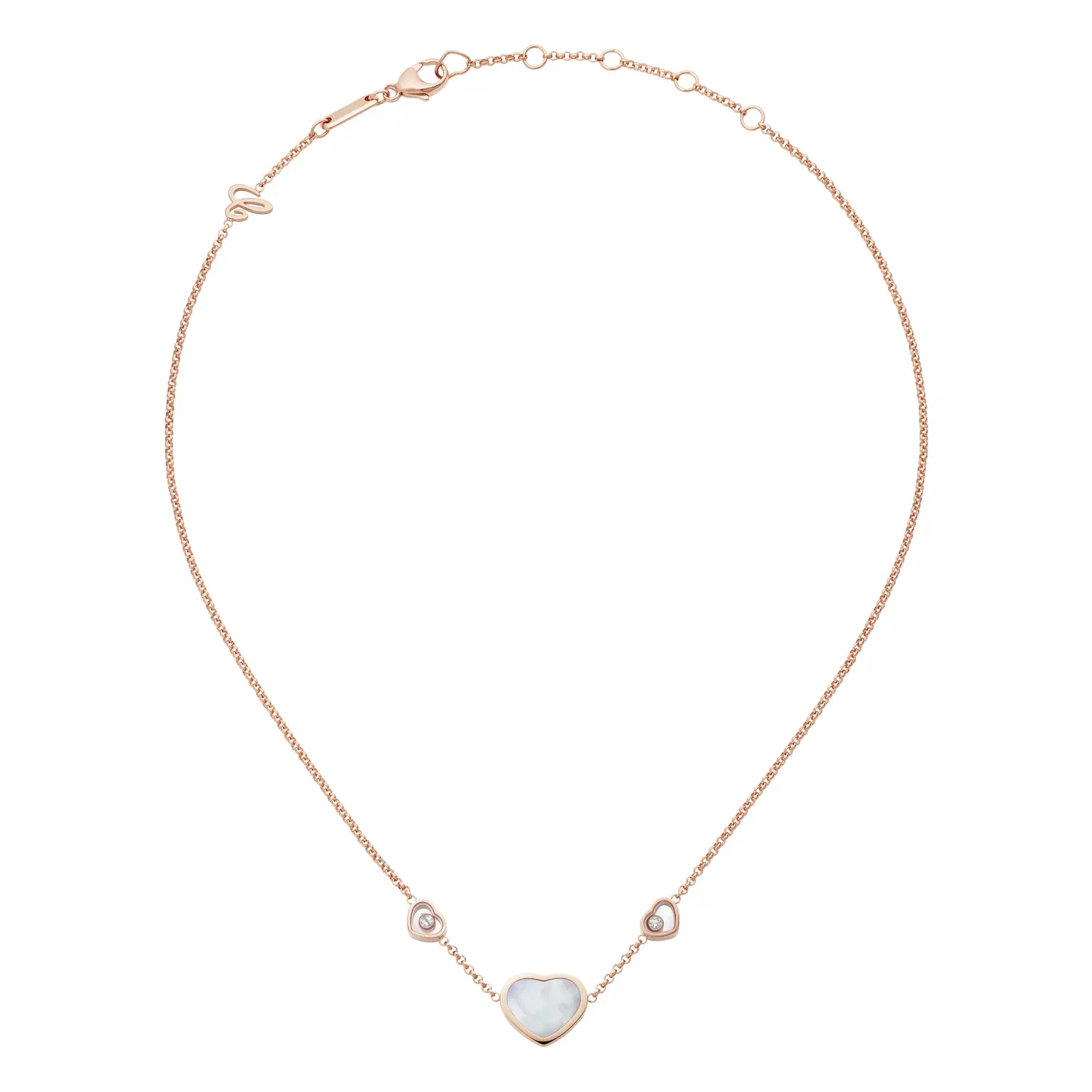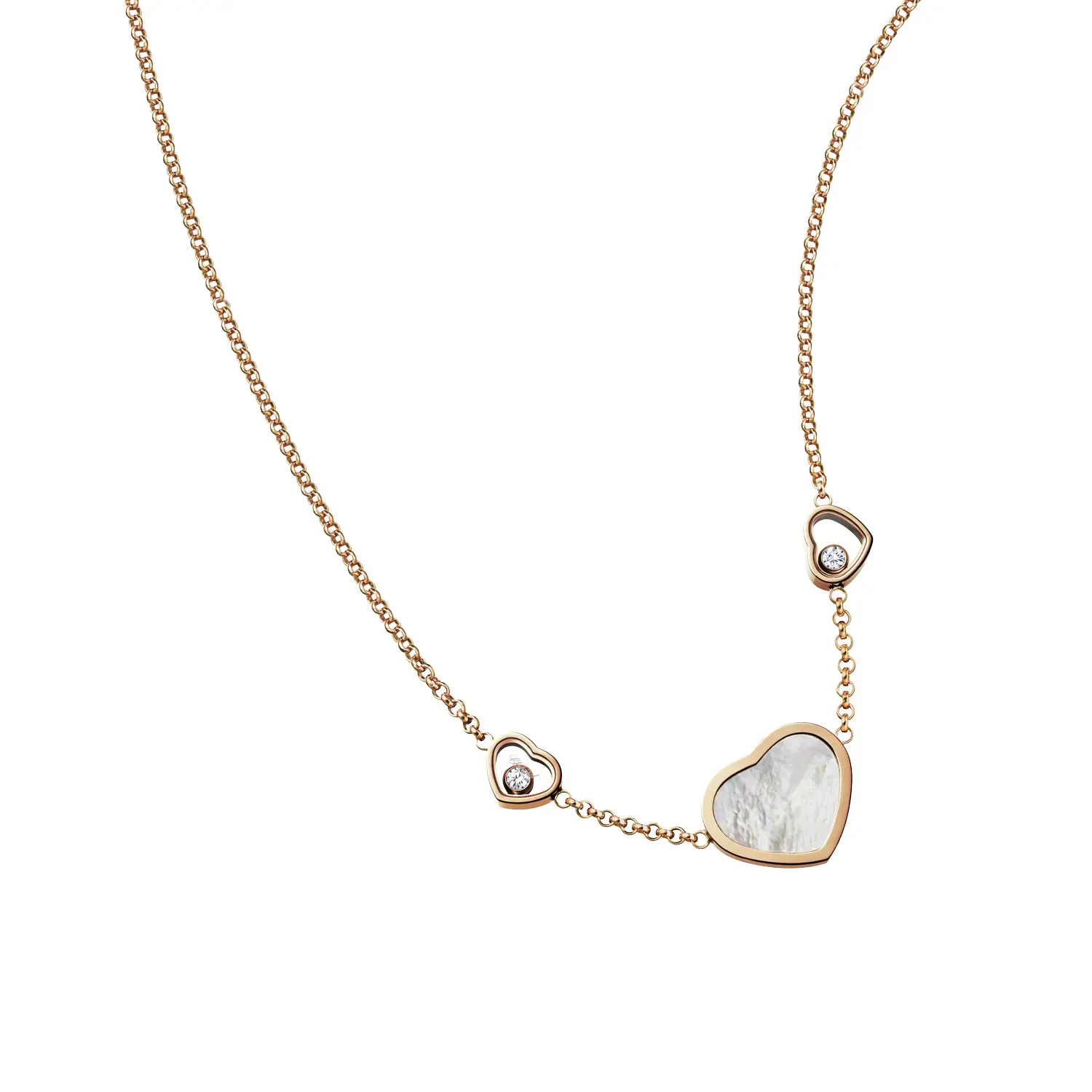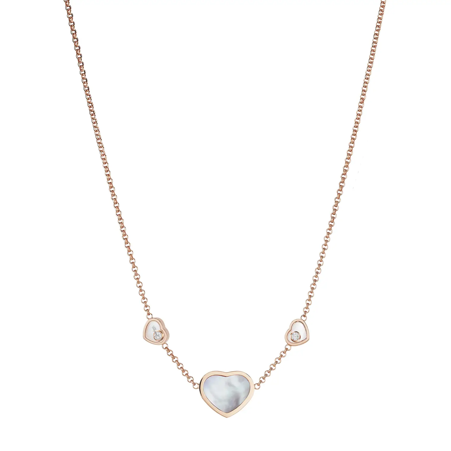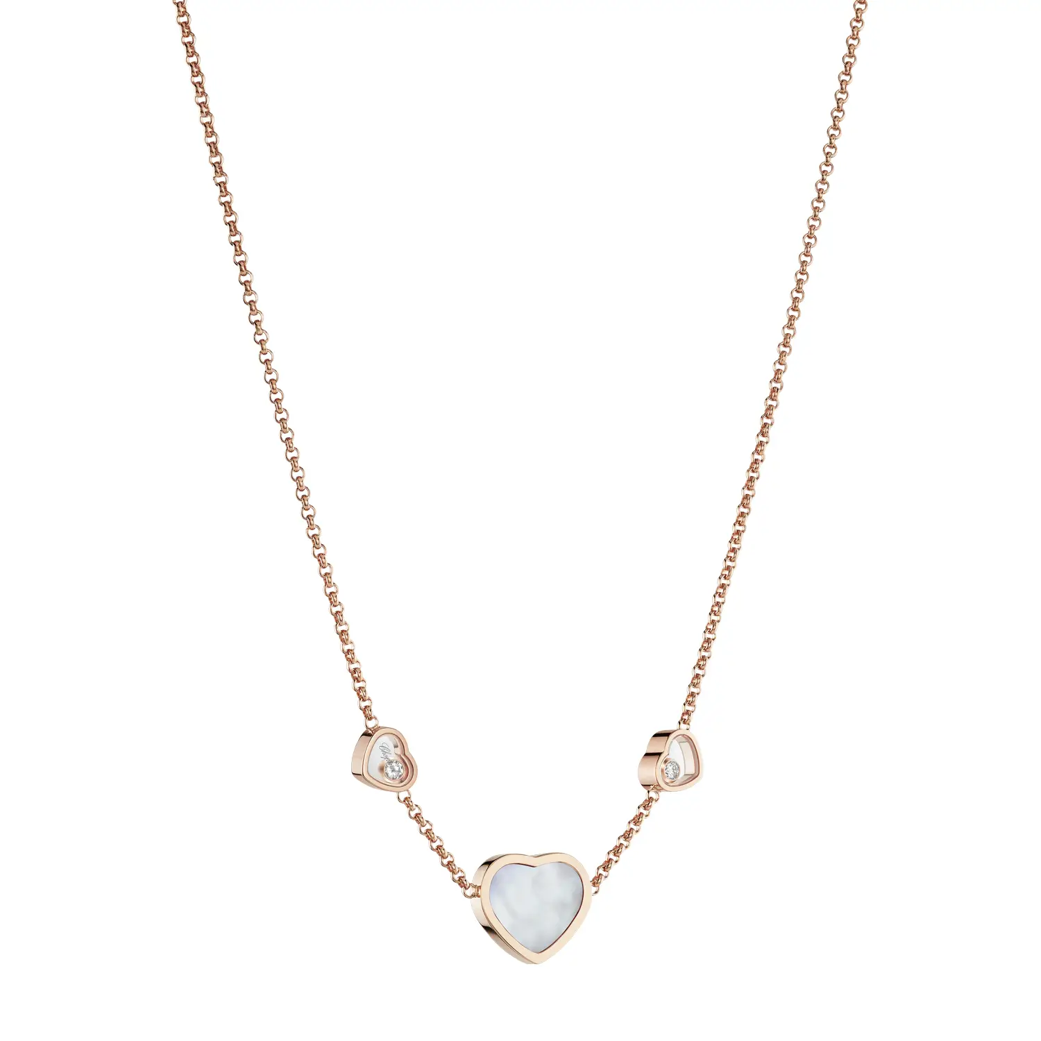 This elegant necklace from the Happy Hearts collection embodies joy, tenderness, and feminine grace – hallmarks of the Chopard spirit. Crafted in 18 k rose gold, it features a heart motif made of genuine mother-of-pearl accented by a sparkling diamond, expressing the brand’s philosophy that “Little Diamonds Do Great Things.” The soft glow of mother-of-pearl combined with warm gold tones creates a harmonious jewel full of playful sophistication.