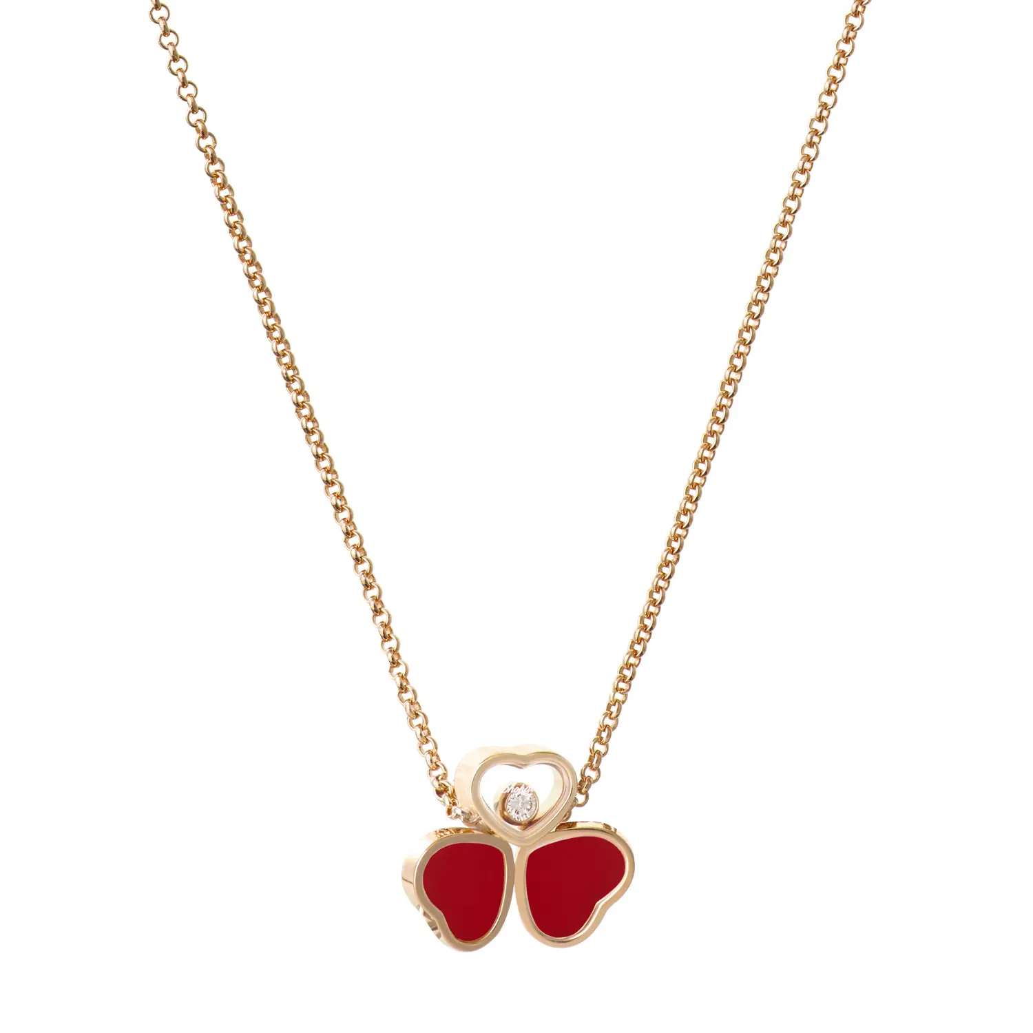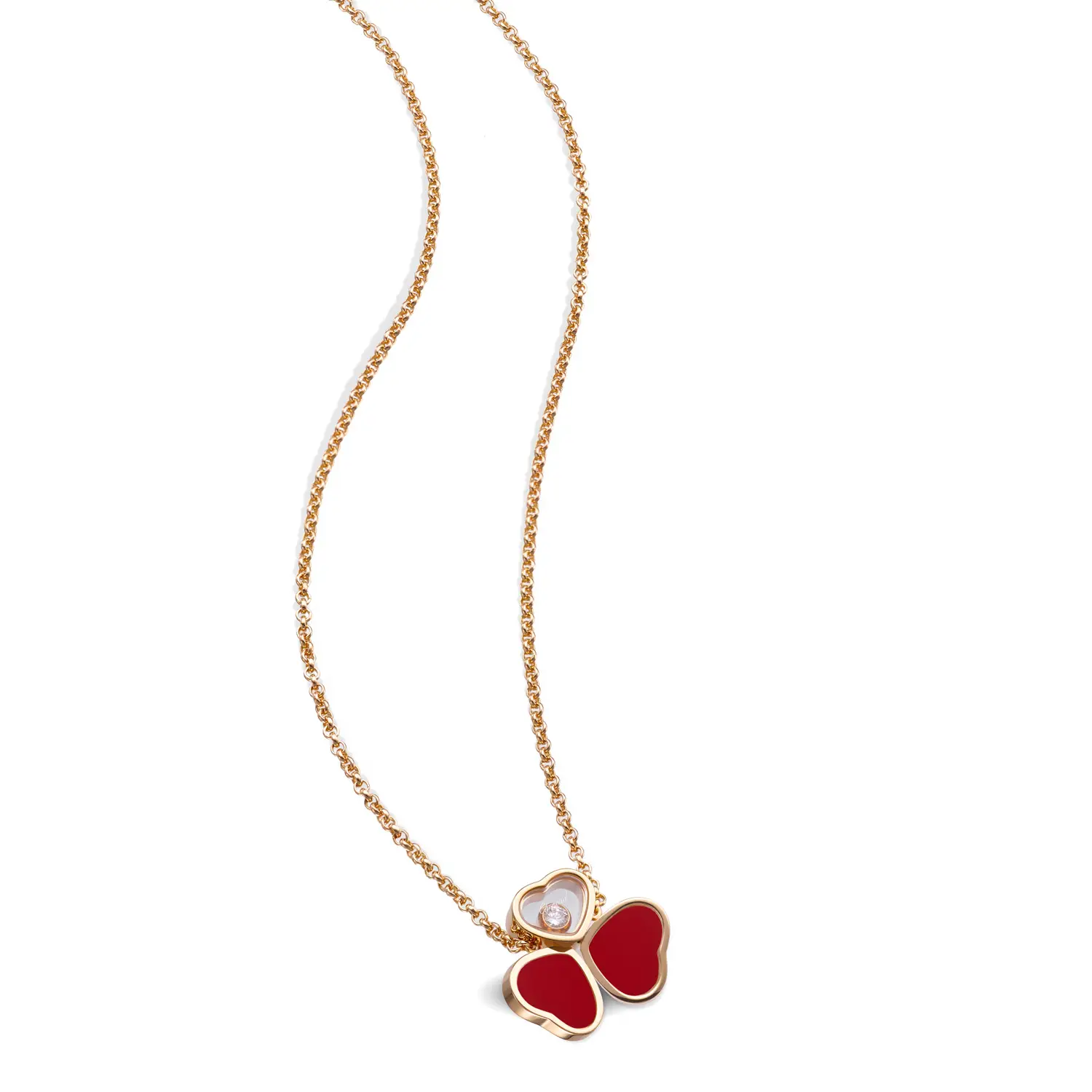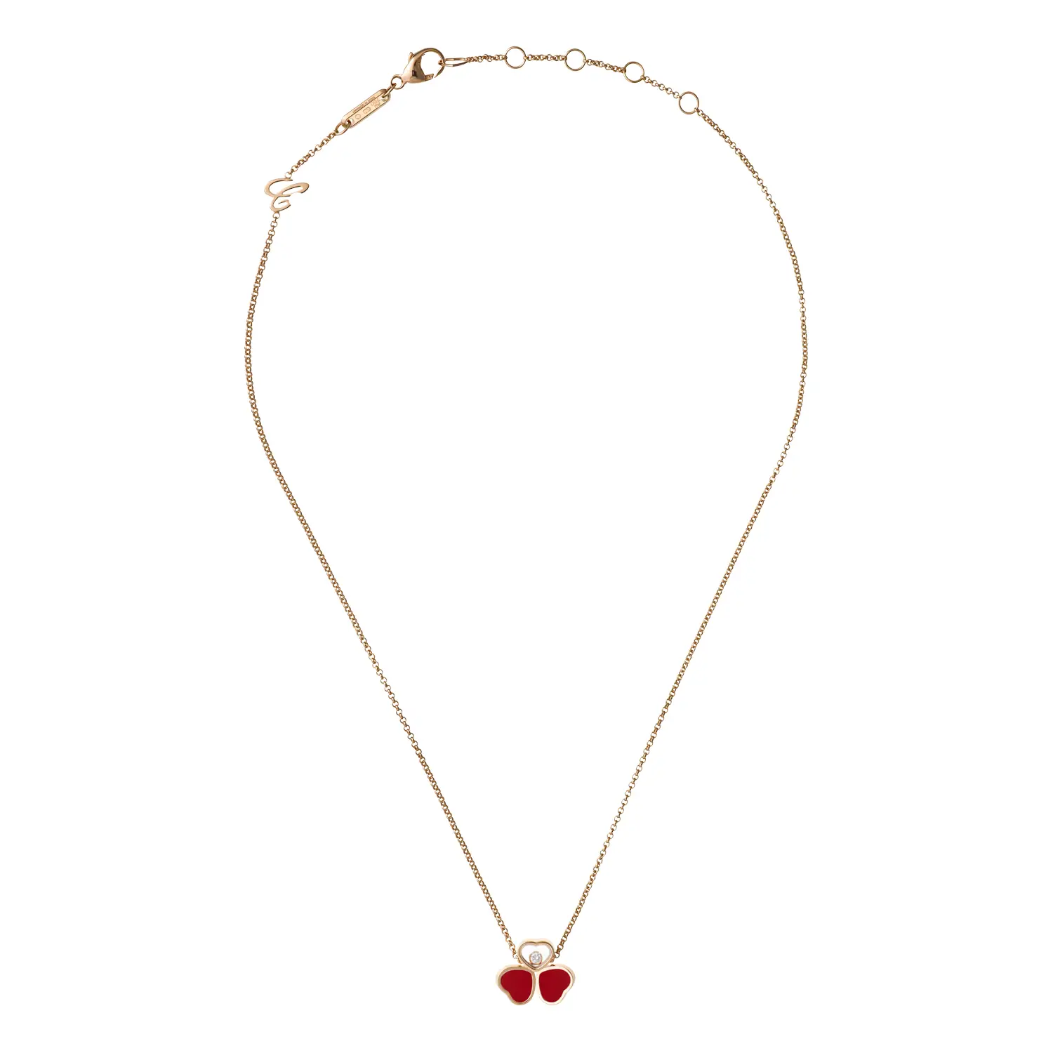 The Chopard Happy Hearts Wings 81A083-5811 necklace is a poetic expression of lightness, elegance, and joy. Crafted from ethical 18-carat rose gold, it features two red carnelian hearts and a freely moving diamond in the center heart. Shaped like butterfly wings, it symbolizes freedom, femininity, and grace.