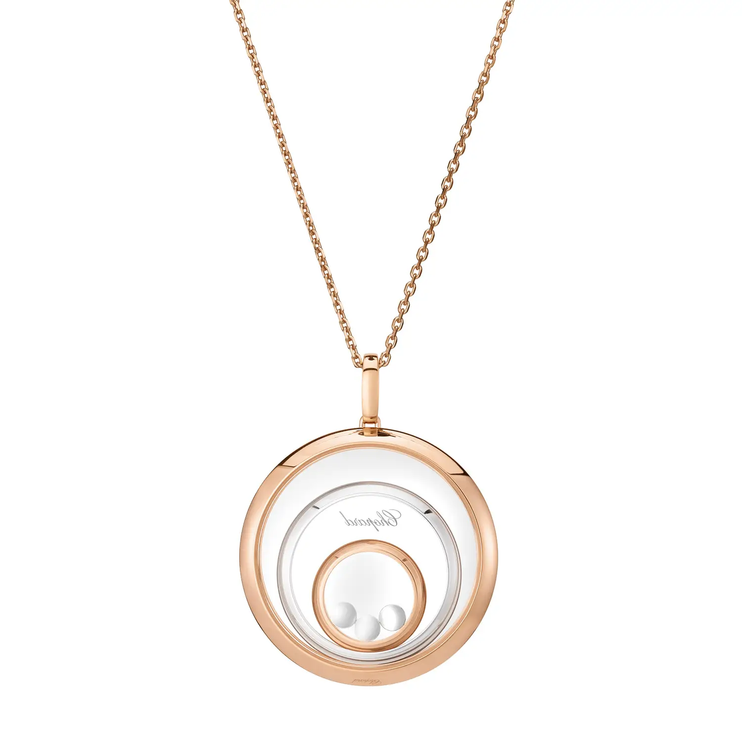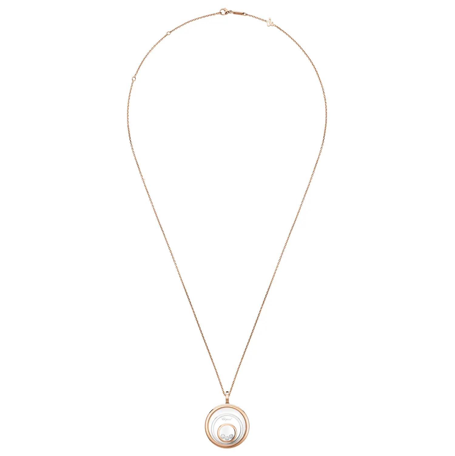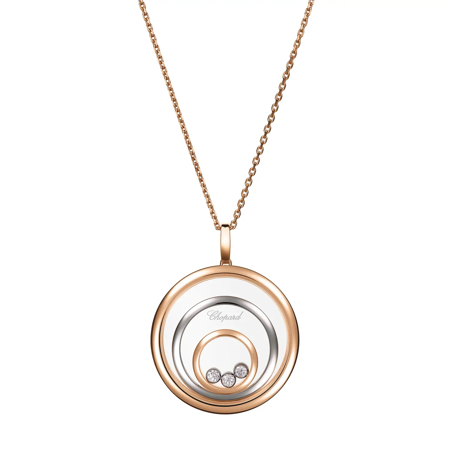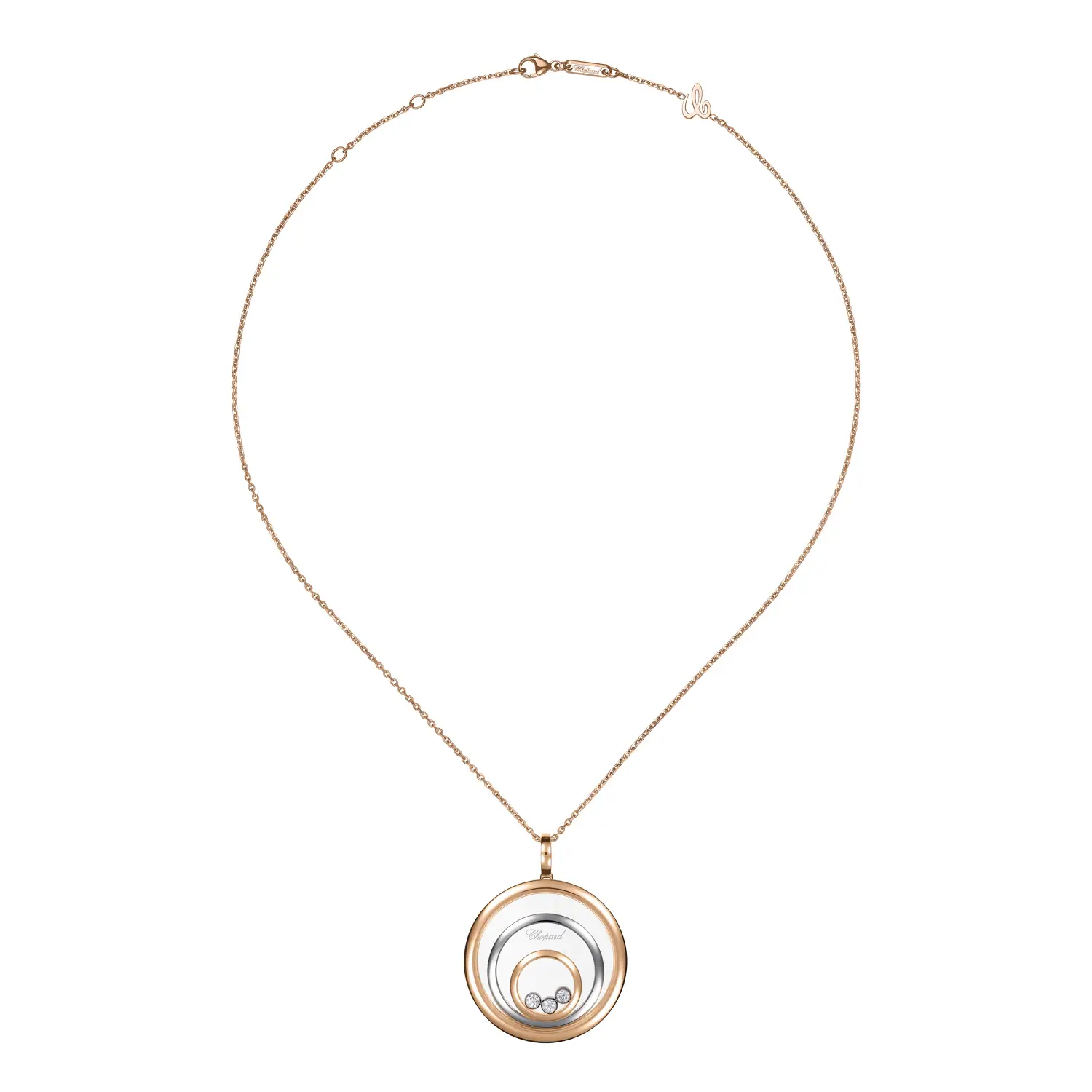 The Chopard Happy Spirit 798232-9001 pendant is a tribute to feminine harmony, movement, and light. Crafted from a blend of ethical 18-carat rose and white gold, it contrasts warm and cool tones for timeless beauty. At its center, a freely moving diamond dances between sapphire crystals, surrounded by concentric circles set with diamonds totalling 0.28 ct — the signature “Happy Diamonds” effect symbolizing freedom and joy.