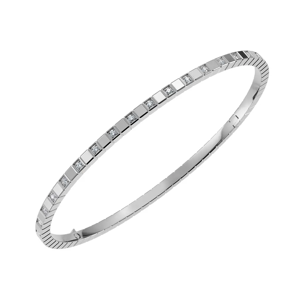 The Chopard Ice Cube 857702-1010 gold bracelet represents modern elegance inspired by the pure lines of ice. This luxurious piece is crafted from 18kt white gold (750/1000) with a perfectly polished finish, giving it a sophisticated and radiant appearance. The bracelet measures 17 cm and belongs to the category of rigid bangle-style bracelets, making it an iconic accessory for both everyday wear and formal occasions.