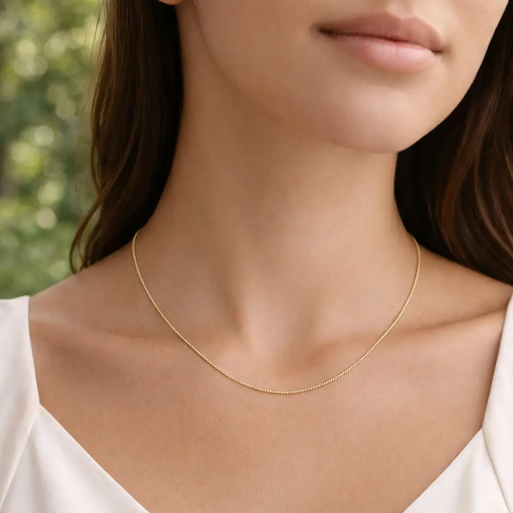 With a length of 45 cm, it sits comfortably on the neck and naturally highlights the décolletage, while the 1.3 mm width gives the chain a delicate yet slightly more distinctive character. Ideal for everyday wear as well as special occasions, it pairs easily with other gold jewelry and represents a versatile accessory with lasting value.