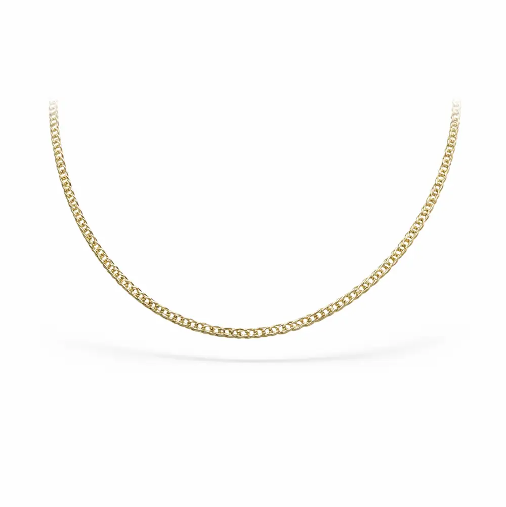 This gold curb chain features a classic, timeless design with an elegant and well-balanced look. The curb-style links form a smooth, continuous line with a subtle shine, making the chain suitable for wearing on its own or as a stylish base for pendants.