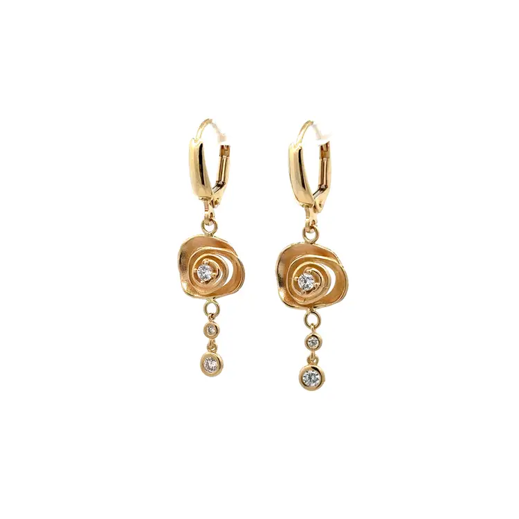 Gold dangle earrings with rose design and sparkling cubic zirconia