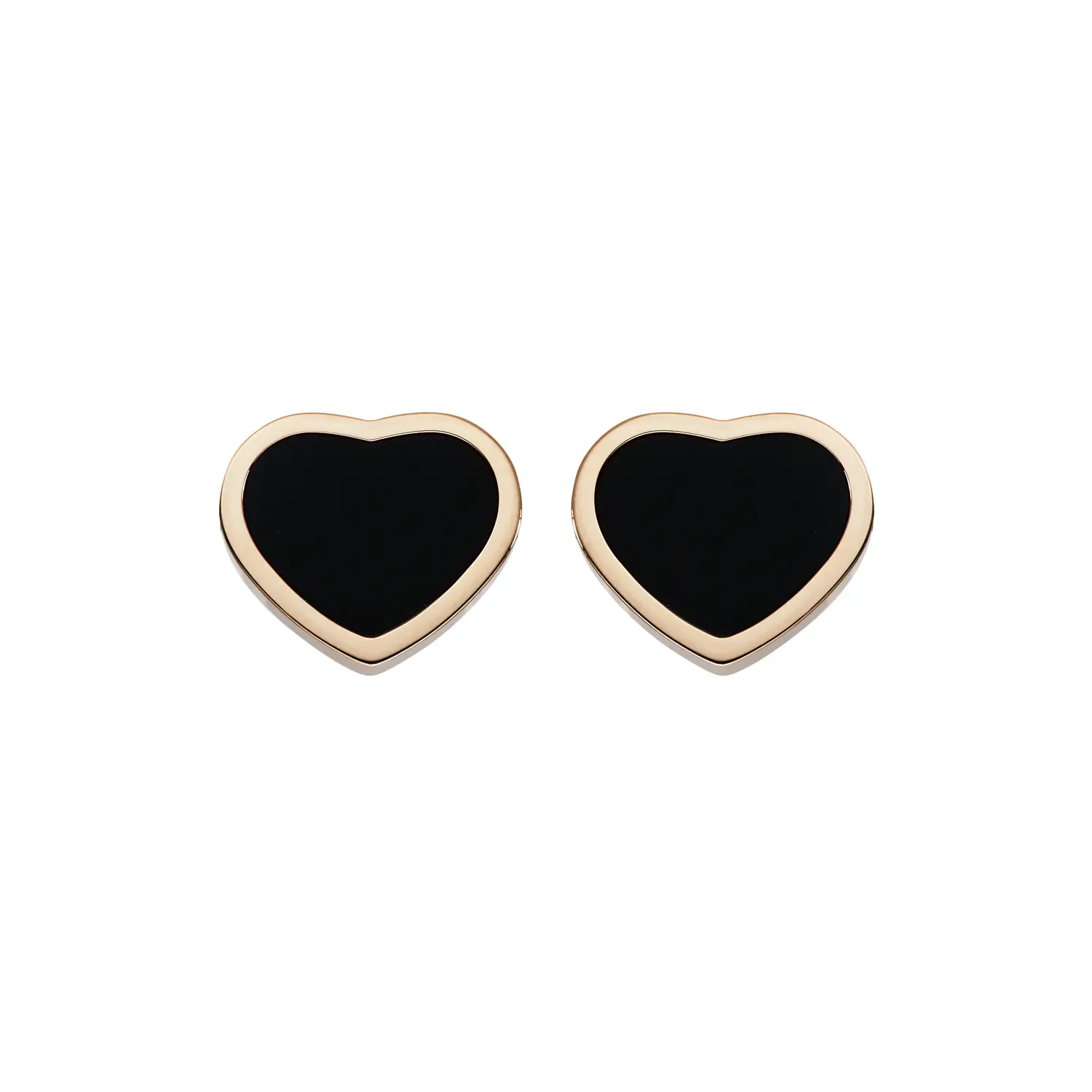 The Chopard Happy Hearts 839482-5201 earrings present a modern yet romantic take on Chopard’s iconic heart motif. Crafted from 18k ethical rose gold, they are adorned with black onyx hearts, creating a striking contrast against the warm tone of the gold and adding a distinctive character to the piece.