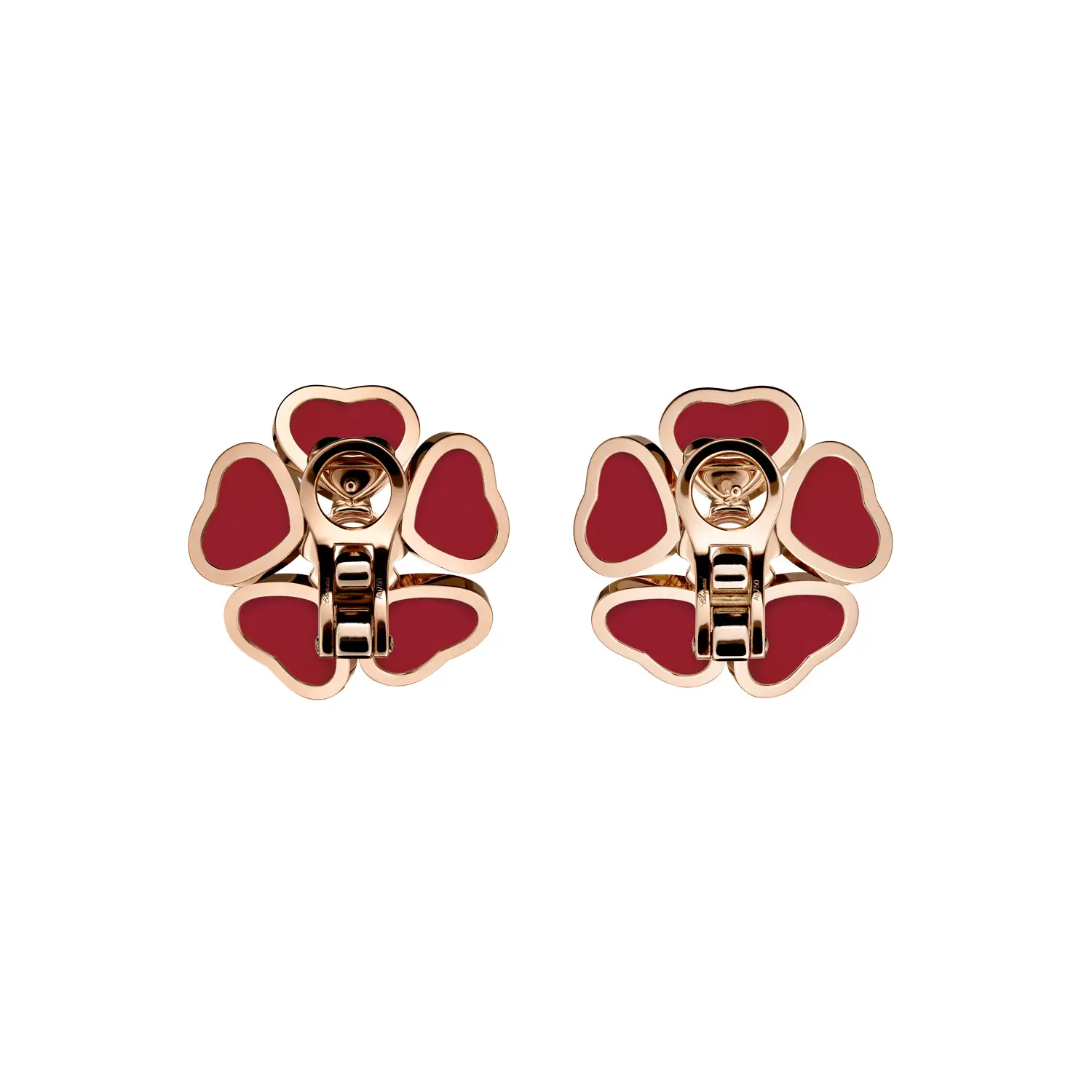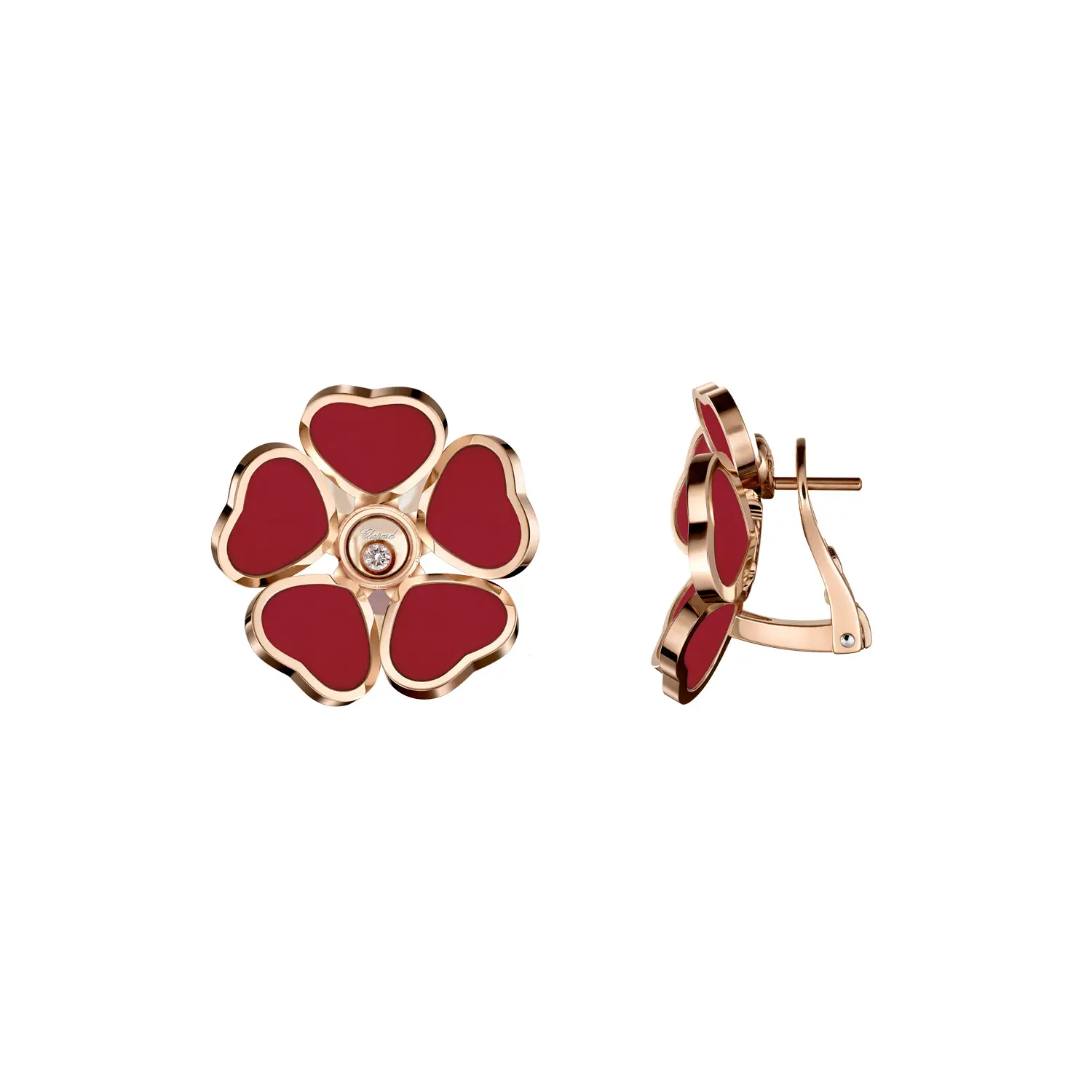 The Chopard Happy Hearts Flowers 84A085-5811 earrings celebrate the joyful harmony of hearts and flowers in a graceful, feminine design. Crafted from 18k ethical rose gold, they are adorned with brilliant-cut diamonds and a vivid red gemstone reminiscent of ruby tones, adding warmth and energy to the composition.