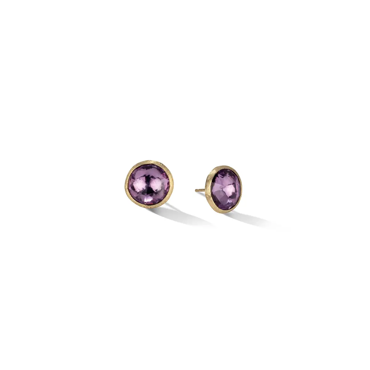 The decorative module measures 13.00 mm in diameter, creating a compact yet distinctive statement. Each earring holds a natural amethyst, in round cut (Round), measuring between 11.00 and 12.50 mm. The delicate violet hue provides a refined contrast to the gold setting, offering sophistication without overt flash.