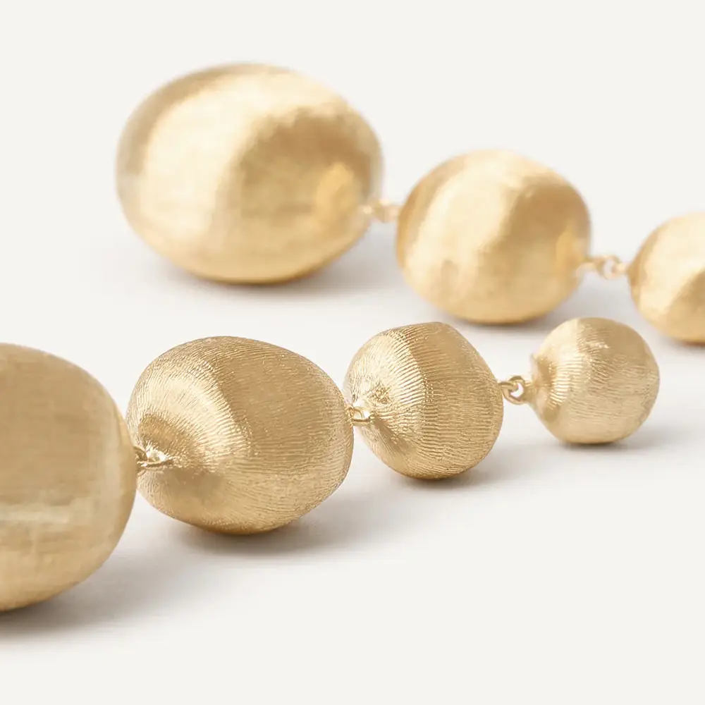 These earrings from the Marco Bicego Africa collection strike a perfect balance between artisanal craftsmanship and contemporary design — ideal for a woman who values jewellery with soul that remains refined and elegant. The shape and matte finish evoke subtle sophistication and a natural, airy feel — reminiscent of exotic landscapes and organic textures.
