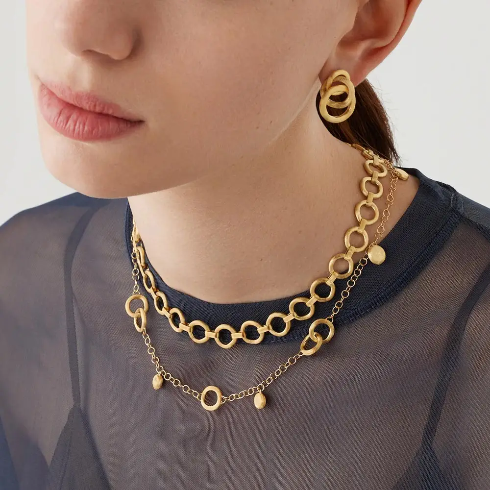 These stylish earrings from the Marco Bicego Jaipur Link collection are crafted from 18kt yellow gold (750/1000) and finished with the brand’s signature matte texture, highlighting the artisanal hand-engraving typical of the collection. The interlocking gold links give the earrings a modern, subtly architectural look that feels both timeless and elegant.