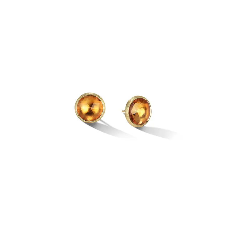 The Marco Bicego Jaipur OB1739 QG01 Y earrings present a refined blend of warm color and delicate craftsmanship. Made in 18 kt yellow gold (750/1000) with a matte finish, they offer a soft, silky surface texture. The fastening is a stud (puzeta), which ensures a discreet and comfortable wear.