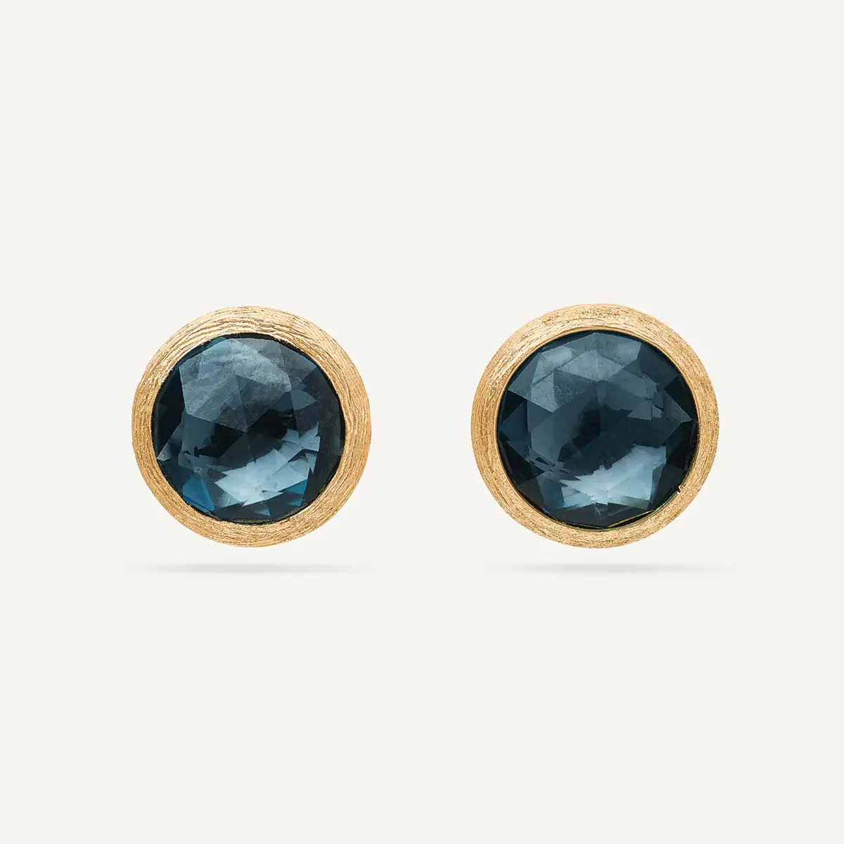 The Marco Bicego Jaipur OB957 TPL01 Y-02 earrings capture the understated elegance characteristic of the Jaipur line, enhanced by a striking gemstone. Crafted from 18 kt yellow gold (750/1000) with a matte finish, they emphasize hand-worked texture and subtlety. They feature stud (puzeta) fastenings for discreet and comfortable wear.