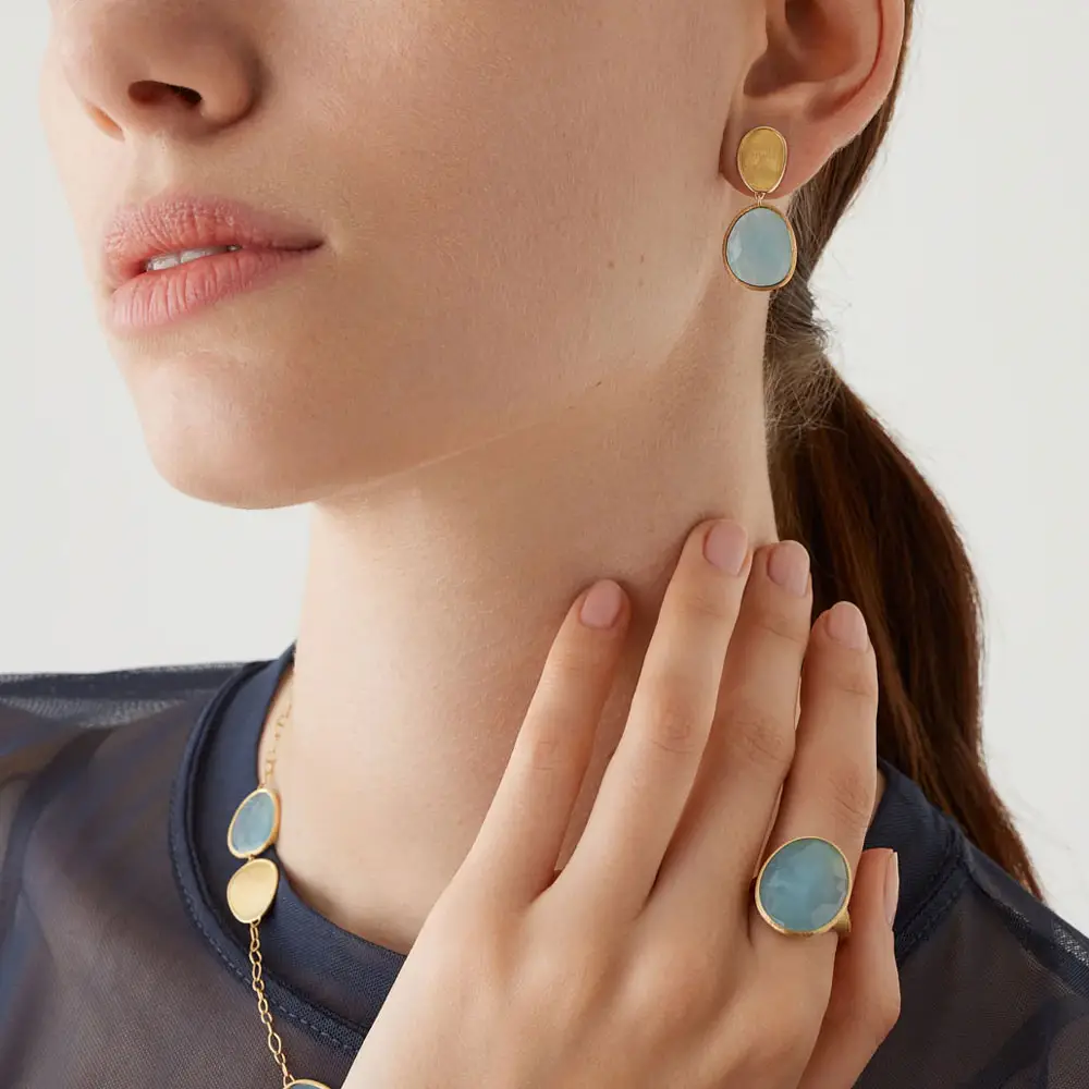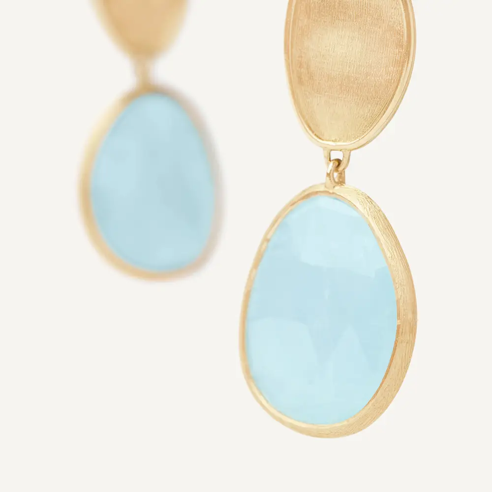 The Marco Bicego Lunaria OB1436 AQD Y earrings capture a subtle balance of nature and craftsmanship. They are made in 18 kt yellow gold (750/1000) with a matte finish, giving the metal a soft, natural texture. The earrings use a stud (puzeta) fastening, providing a discreet and secure fit.