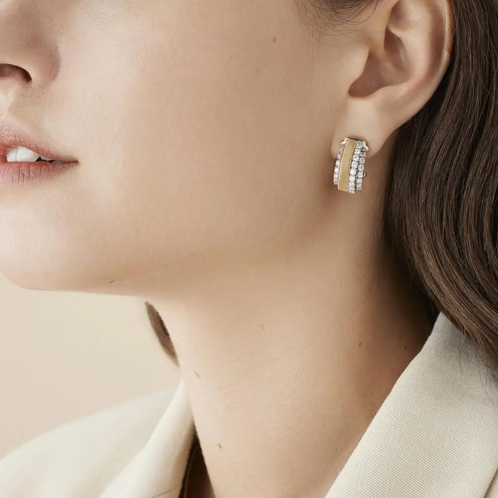 The Marco Bicego Masai OG B2 YW M5 earrings project a powerful luxury statement through their combination of prominent diamonds and sophisticated goldwork. Crafted from combined gold 18 kt (750/1000), they feature both polished and matte surfaces — a contrast that highlights form and detail. The earrings use stud (puzeta) fastenings for secure and comfortable wear.
