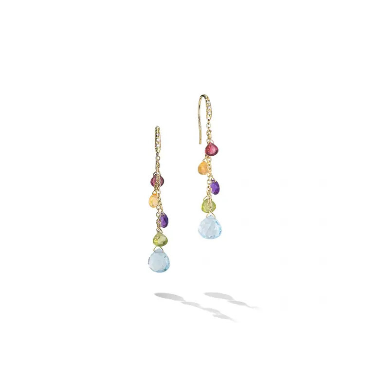 The Marco Bicego Paradise OB1743 AB MIX01T Y earrings radiate a joyful palette of colors combined with refined jewelry craftsmanship. They are crafted in 18 kt yellow gold (750/1000) with a polished finish, enhancing both the brilliance of the metal and the gemstones.